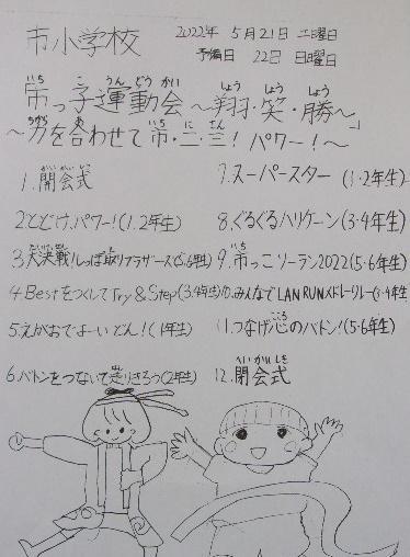 本日、『市っこ運動会~翔・笑・勝~』を開催しました。ご観覧いただいた保護者の皆様、本当にありがとうございました。運動会のテーマ「力を合わせて 市・二・三!パワー!」の通り、全校生が力を合わせて、最高の運動会を作り上げることができました。今日は、短い練習期間の中で、毎日一生懸命練習してきた子どもたち一人ひとりの頑張る様子を見ていただけたのではないかと思います。たくさんの方に見ていただける緊張感と喜びで、子どもたちの瞳がうれしそうにキラキラと輝いていました。そしていつも以上に力を出せていたように感じました。3年ぶりの春の運動会、今できることを考え、工夫しながら取り組んできました。今後も市っこが目標を持ち、みんなで力を合わせて頑張れるよう、ぜひ今日は運動会のことを話題にして、ほめてあげていただければと思います。