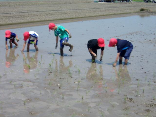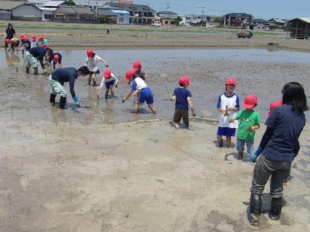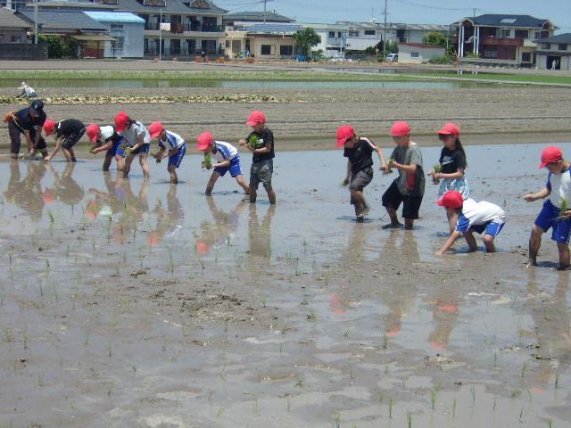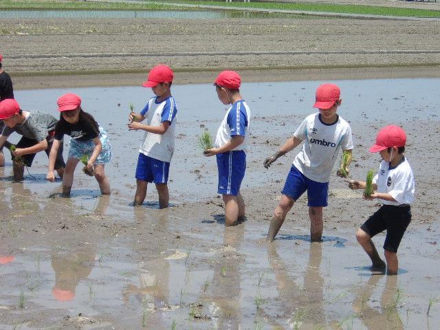 9日、午前中に3年生の田植えを予定通り行いました。2つのグループに分かれて田んぼに入り、赤い印をつけたロープをものさしに、横一列に並んで植えていきました。泥に足を取られて、こけてしまう場面も見られましたが、とても楽しそうに田植えをしていました。これから、どのように成長していくのか観察ができるといいなと思います。田植えを体験させてくださったたくさんの方に感謝です!秋には収穫体験もあります。1本の苗からどのくらいのお米ができるのか、楽しみですね。