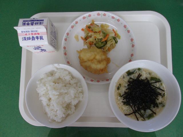 今日の献立は、「ハモの天ぷら・キャベツ和風和え・にらと卵汁」でした。毎日、給食の時間に保健委員会の子どもたちが、給食センターからの「ひとことだより」や食育に関するお話などを放送しています。今日は、献立のハモが今年2回目の登場だったことや秋のハモのおいしさについて紹介していました。毎日少しの話題ですが、積み重ねるとたっぷりの食育になりますね。今日もみんなでおいしくいただきました。