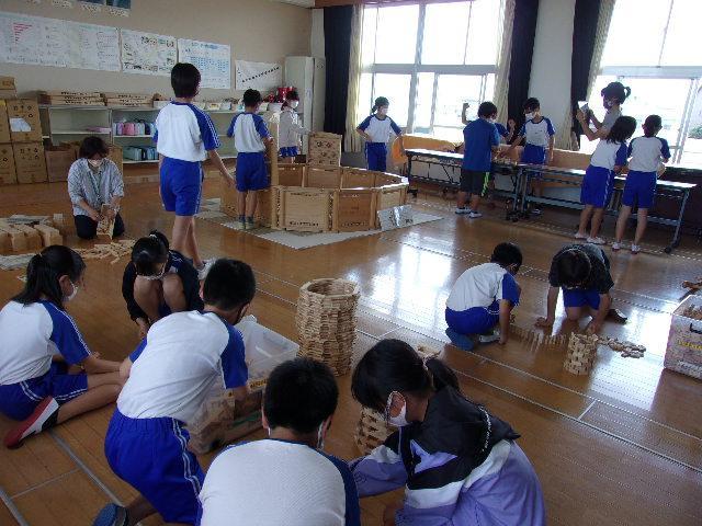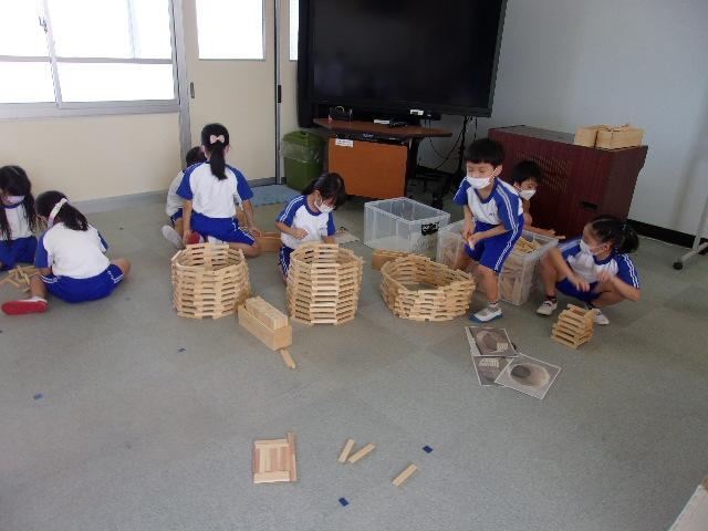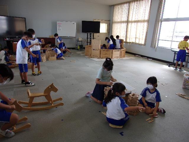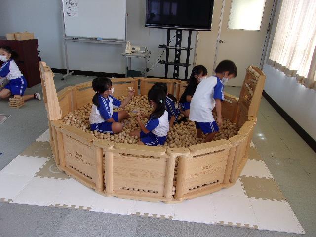 12日(月)、13日(火)の2日間、淡路県民局主催の「淡路島『木育』推進プロジェクト」の取組を実施しました。これは、木のおもちゃなどに触れて遊ぶことを通して木材への親しみや木の良さを感じる機会をつくるという取組です。たくさんの木のおもちゃを用意していただいたので、部屋に入るととてもいい木の香りがして、子どもたちは生き生きと様々なおもちゃを手にとって遊び始めました。温かい木のぬくもりを感じながら、工夫して遊んでいました。同じおもちゃでも積み重ね方や並べ方が異なったり、一人で遊んだり友だちと協力したりなど様々な遊び方で楽しむ姿が見られました。