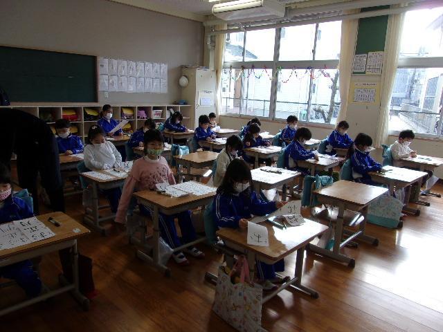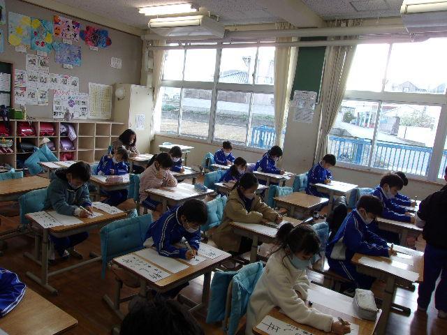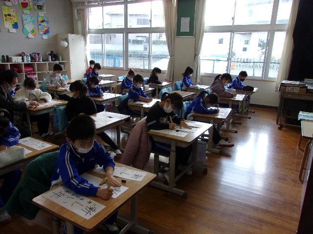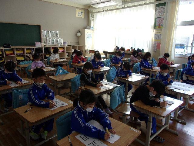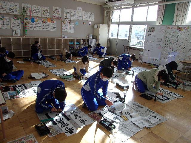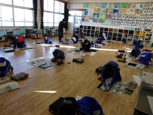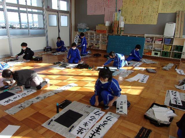 始業式のあと、各学年それぞれの場所で「書初め」を行いました。1・2年生はペンで、3年生以上は毛筆でチャレンジしました。子どもたちは真っ白な紙に向かい、心を落ち着けて、一文字一文字丁寧に筆やペンを運んでいました。冬休みの練習の成果が発揮できていたようです。