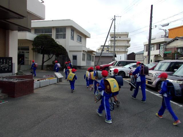 今日から集団登校です。登校班のお兄さんやお姉さんと一緒に元気に登校してきました。校門で様子を見ていると、みんなしっかりと元気にあいさつをすることもできました。これから、毎日、雨の日も風の日も暑い日も歩いて登校することになります。いろいろな季節の変化を感じることもできると思いますが、まずは交通ルールを守って、安全に登校してほしいと思います。