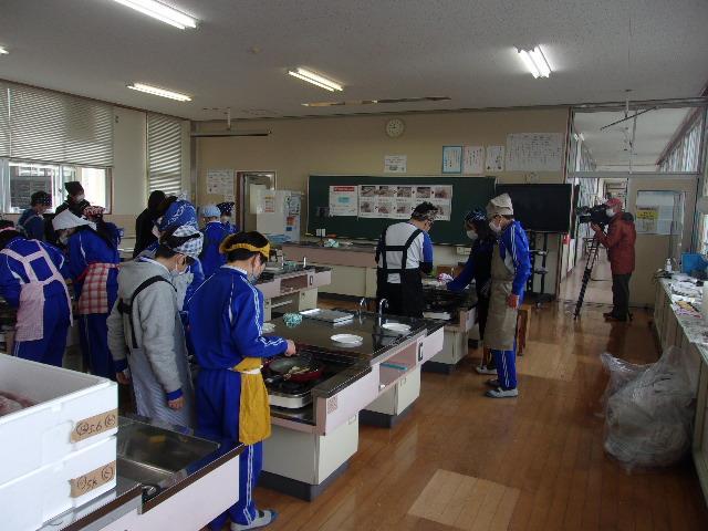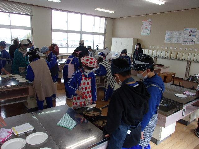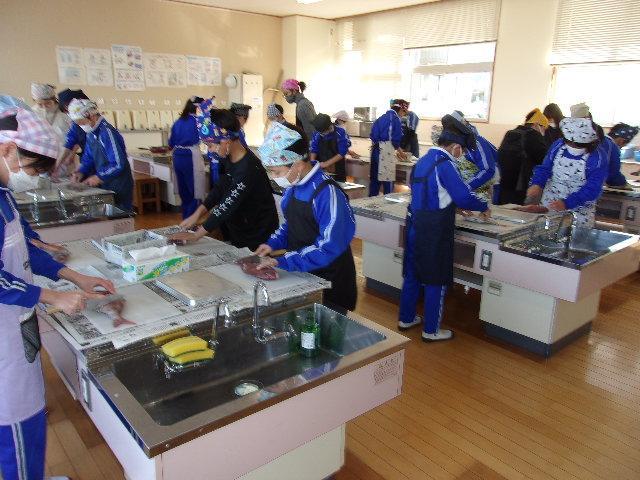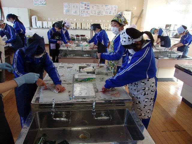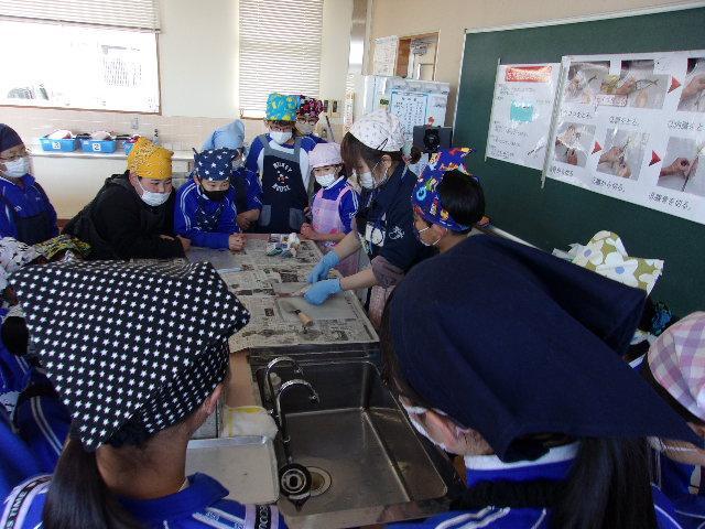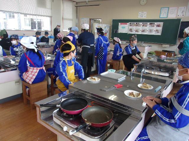 5年生が魚料理にチャレンジしました。南あわじ市の『地元の魚をさばいて食べよう』という取組です。兵庫県漁業協同組合連合会の方に教えていただきながら、一人一匹「鯛」の調理をしました。大きな鯛なので骨も硬く、うろこもしっかりしていましたが、子どもたちはそこら中をうろこだらけにしながらも一生懸命さばいていました。なんとか全員3枚おろしにすることができ、フライパンでソテーしていただきました。魚をさばくのは思った以上に大変だと感じた子どもたちもいたようですが、おいしそうに焼けた鯛は身がふっくらとしていて「とてもおいしい。」という感想が聞かれました。県漁連の方から、「瀬戸内海を豊かな海に」ということや水産業のことについてなども教えていただきました。調理台の片付けはもちろんのこと、うろこだらけになった家庭室も隅々までしっかりと掃除をしました。