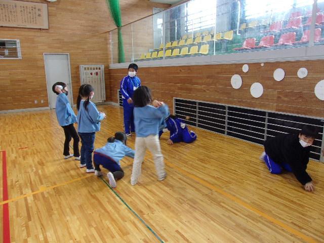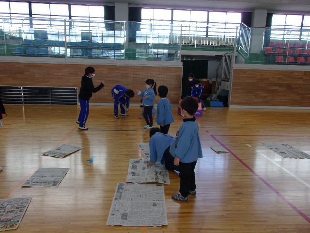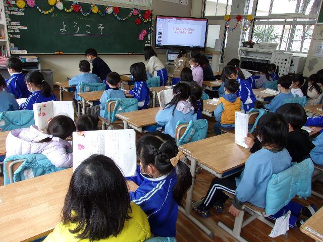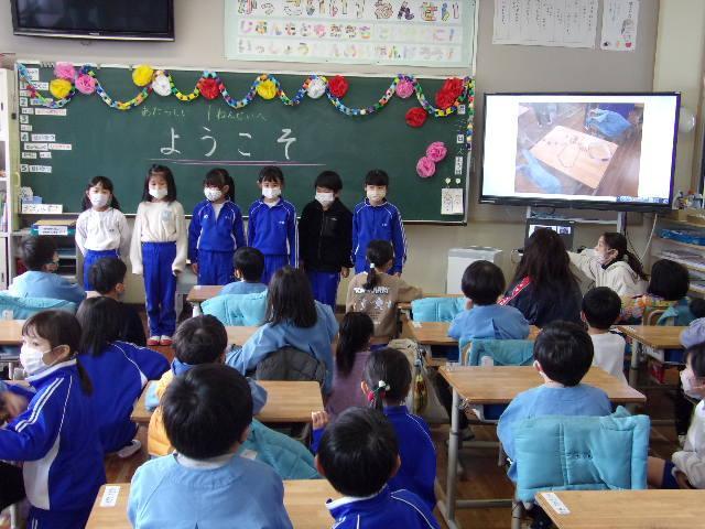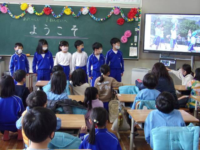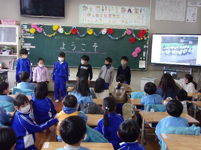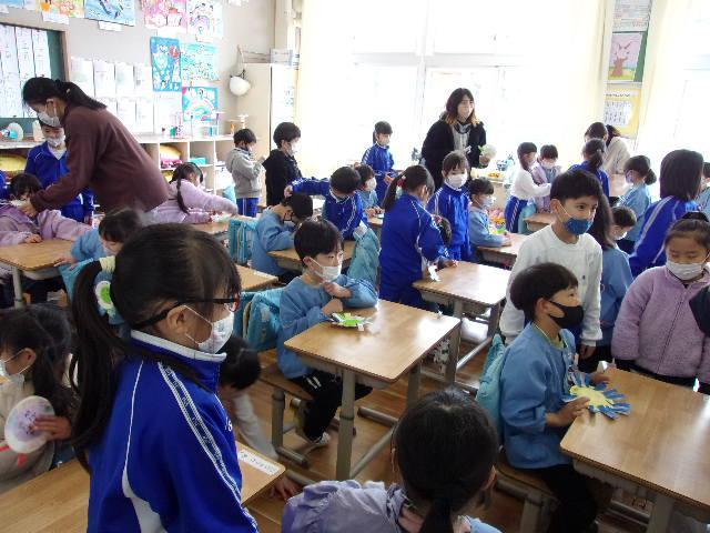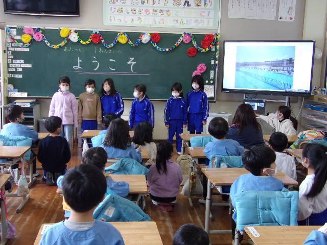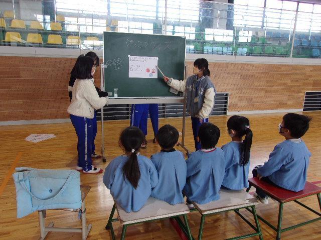 21日(火)、年長さんと児童の交流を行いました。園も小学校もどちらも2クラスずつなので、今日は片方のクラスだけです。前半は体育館で5年生が考えた遊びに参加してもらいました。年長さんたちは、5つのブースを順に巡って遊び、とても楽しそうにしていました。後半は1年生と。教室で国語の教科書を見せながら、音読を聞かせてあげました。その後は、1年間の学校生活を紹介して、メダルのプレゼント。年長さんたちは、きっと入学を楽しみにしてくれることでしょう。そして1年生と5年生も、新しい1年生を迎える心構えができたことでしょう。明日は、1年2組と5年2組が交流活動に取り組みます。