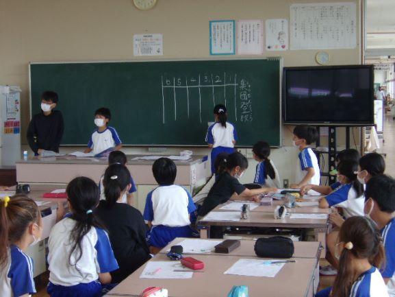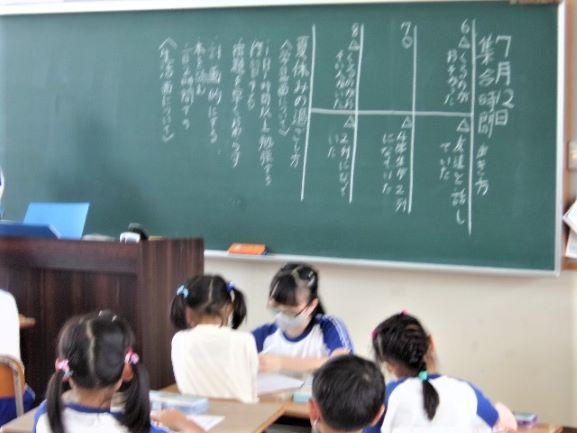 今日の1時間目、近づいてきた夏休みに向けて、地区別の校外児童会を行いました。内容は、登校班の反省、夏休みの学習や生活についての話し合い、ラジオ体操等の行事の確認でした。話し合ったことを子どもたちは自分でプリントに記入していくのですが、1年生の児童は、黒板に記録されたものを写すのが大変で、高学年の児童がていねいに教えたり、助けたりする姿が見られました。7月に入って暑さが厳しくなり、熱中症が心配される中ですが、子どもたちは1学期のまとめに取り組んでいます。元気に楽しい夏休みが迎えられるよう、ご家庭でも体調管理に注意をお願いいたします。