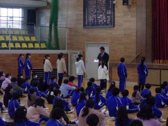 今日は24回目の読み聞かせがあり、4年生では『バスが来ましたよ』が読まれました。内容は、目の不自由な方のバスの乗り降りを小学生が何年にもわたってお手伝いする話でした。絵本としては文字が多く、長いお話でしたが子どもたちは集中してきいていました。市小学校では3・4年生の総合的な学習の時間に視覚障害や聴覚障害について学びます。その学びが今日の作品につながり、子どもたちが興味をもったのかなと感じました。昨日は児童集会があり3学期の学級委員の任命を行いました。卒業、進級まであと2か月です。それぞれの学級のまとめを学級委員を中心にしてほしいと思います。
