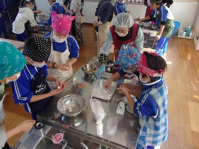 今日は、5年生が南淡路生活研究グループ連絡協議会、ばぁばの会、南あわじ普及センター、南あわじ市役所の方にご指導・ご協力をいただいて、ちょぼ汁づくりに挑戦しました。ちょぼ汁づくりは5年生が総合的な学習の時間の中で、1学期のササゲ豆の栽培から始めて、2学期の味噌づくり、そして今日と1年間かけて計画的に取り組んできました。ずいきの下ごしらえ以外は、子どもたちがアドバイスをいただきながら自分たちで調理しました。できあがったちょぼ汁は出汁がきいてとてもおいしく、初めてたべたALTのドム先生も「good!」と言っていました。