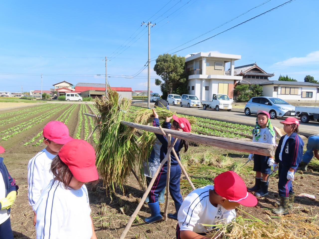 老人会の皆様にお世話になり、稲刈り体験を行いました。 始めて、かまをもつ児童もいましたが、全員無事、老人会のご指導のもと稲を刈る事ができました。最後に稲を束にくくり、乾かすために木の長い棒にかけました。みんな楽しく活動を終えることができました。老人会の皆様ありがとうございました。