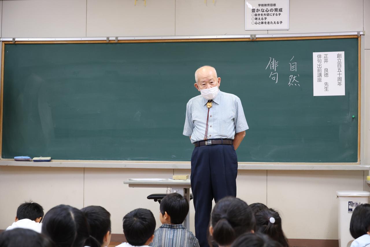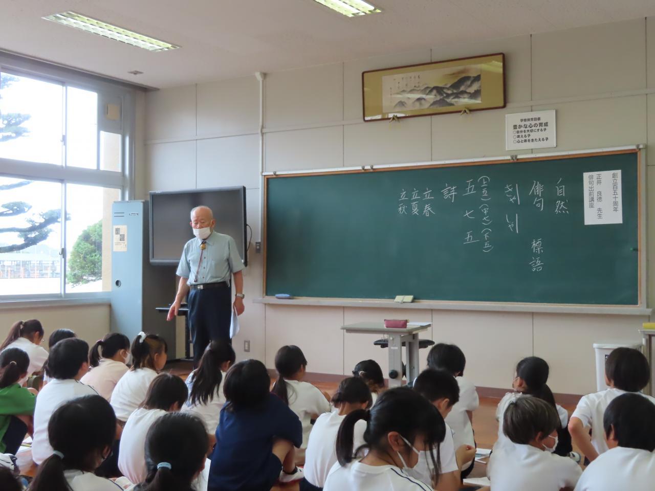 永田青嵐顕彰全国俳句大会(淡路島くにうみ協会主催)の選者でもある神代出身の正井良徳先生に俳句の出前講座をお願いしました。淡路文化協会会長・あわじ人形協会の理事長もされ、お忙しい中、来ていただきました。低中高に分かれて、正井先生の俳句講座を受講しました。季語を入れる、五七五の定型などの基本的な説明、身近な句材をあげながら句の鑑賞等のお話をしていただきました。そして全校生が俳句を作り各学年から正井先生に選句をしていただく予定です。展示もする予定です。