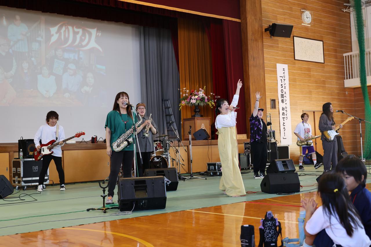ボーカルのYUMIさんの透き通った高音が体育館に響き渡りました。お昼の放送で聞いていた曲が演奏されると、一緒に「三角形、三角形のひみつは♪♪」と口ずさむ児童もいました。途中、楽器紹介もあり、最後には「校歌」の熱唱、熱いライブが終わりました。