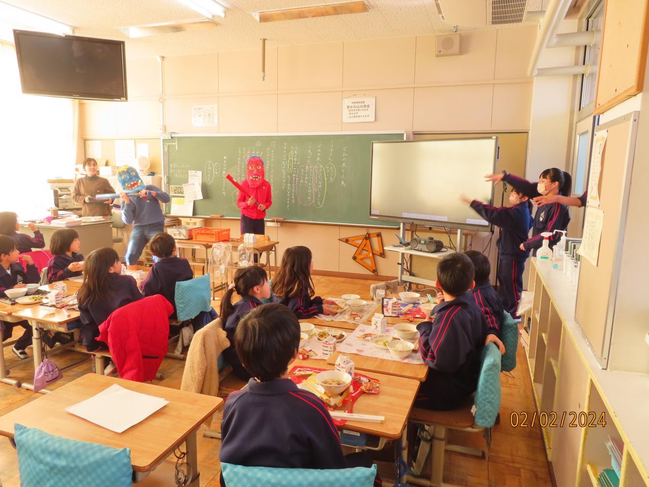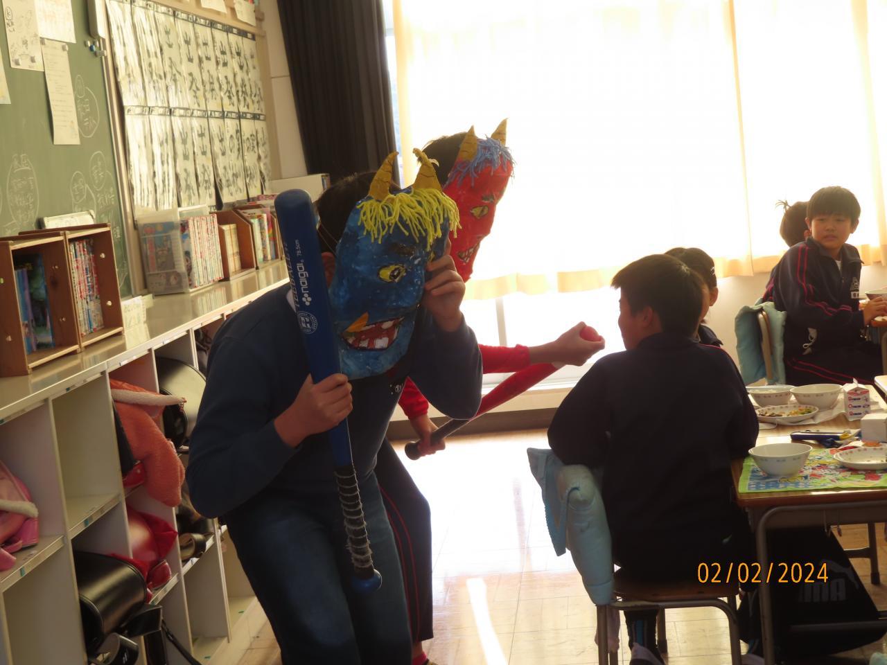 給食の時間に廊下から「助けて~」の悲鳴が聞こえるではありませんか。びっくりしてのぞいてみるとなんと教室に赤鬼と青鬼が乱入してきました。「鬼は外 福は内」と、みんなで「エアーマメまき」(まめをまくしぐさをしながら叫びました。)をしました。とても優しそうな鬼さんたちでした。