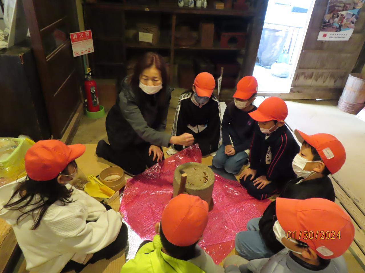 老人会の方にお世話になり今年も七輪でおもちを焼きました。1月30日に見学にいってき北淡民俗資料館でひいたきな粉をまぶして食べました。石臼でひいたきな粉に七輪で焼いたおもち、昔ながらの調理方法でこんなにおいしいとはびっくりした様子でした。