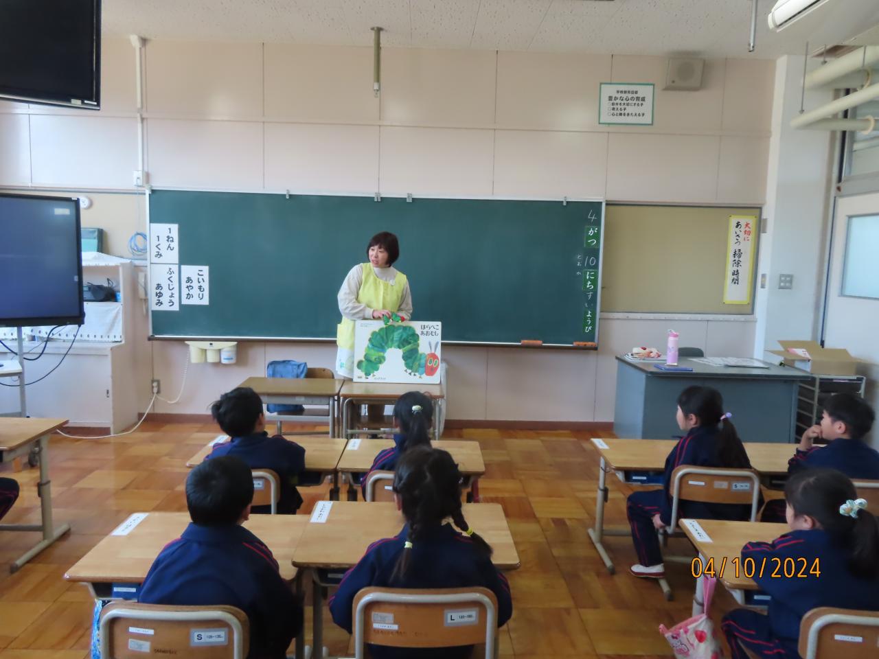 毎週水曜日に司書の小川先生に来ていただいています。読み聞かせや図書室の整理等のお仕事もしていただいています。