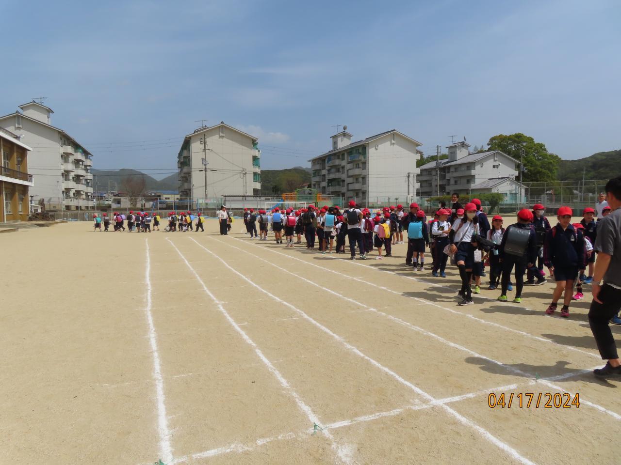 自己紹介、集合時刻の確認などを行いました。6年生を先頭に班で帰りました。1年生に気を配りながら、危険個所に注意しながら下校しました。