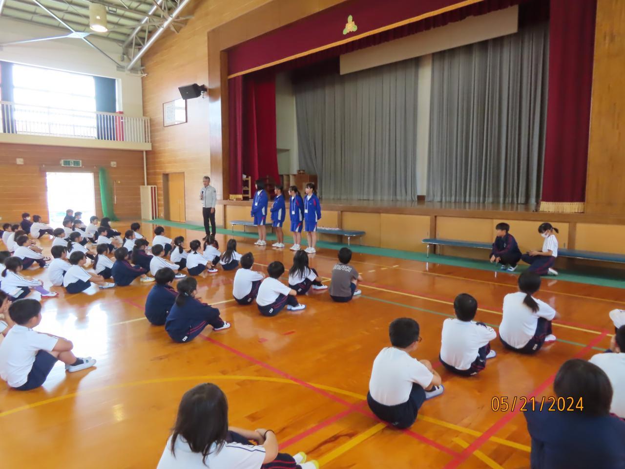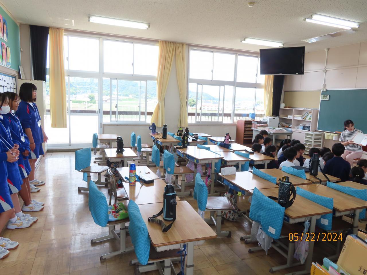 三原中学校から2年生が4人トライやるに来ています。火曜日に児童集会を行い、自己紹介をしてもらいました。安全ぼうやの制作、読み聞かせ、授業の補助等、意欲的に児童との交流を行っています。6年生に中学校の紹介もしてもらいました。先生のこと、給食のこと、先輩のこと、いろいろな質問に中学生が答えてくれました。