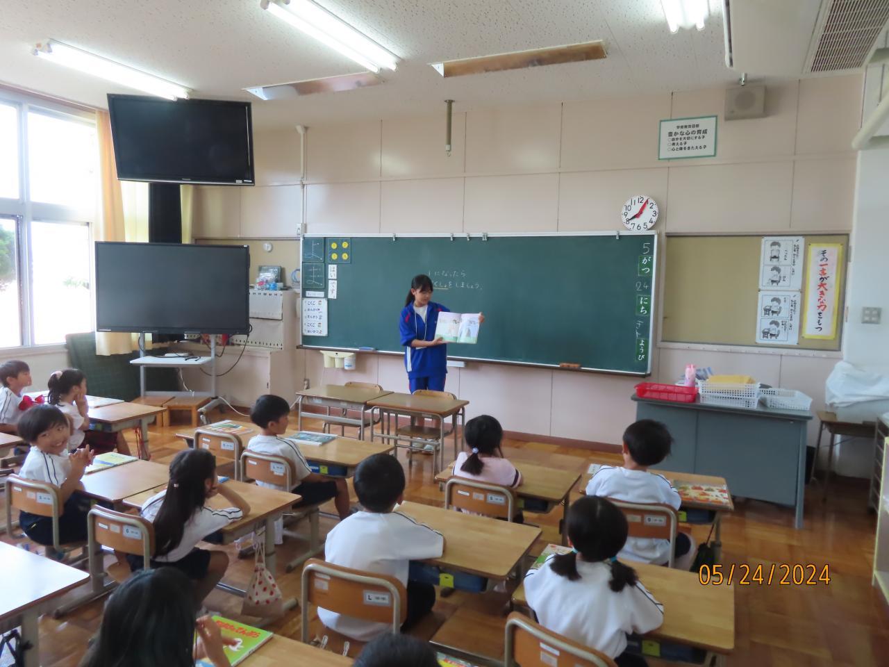 先生方が各教室で読み聞かせを行っています。先生方はローテーションを組んで、いろいろなクラスに読み聞かせにいっています。どんな絵本を読んでくれるのか子どもたちは楽しみにしています。