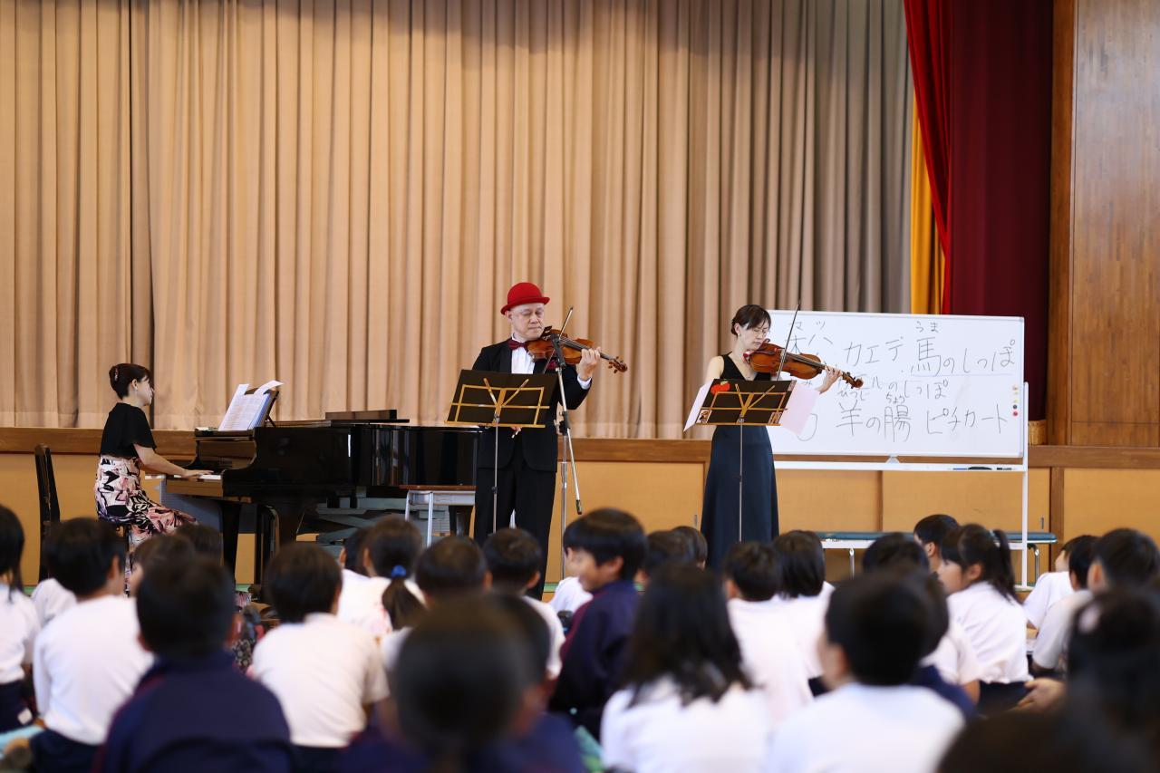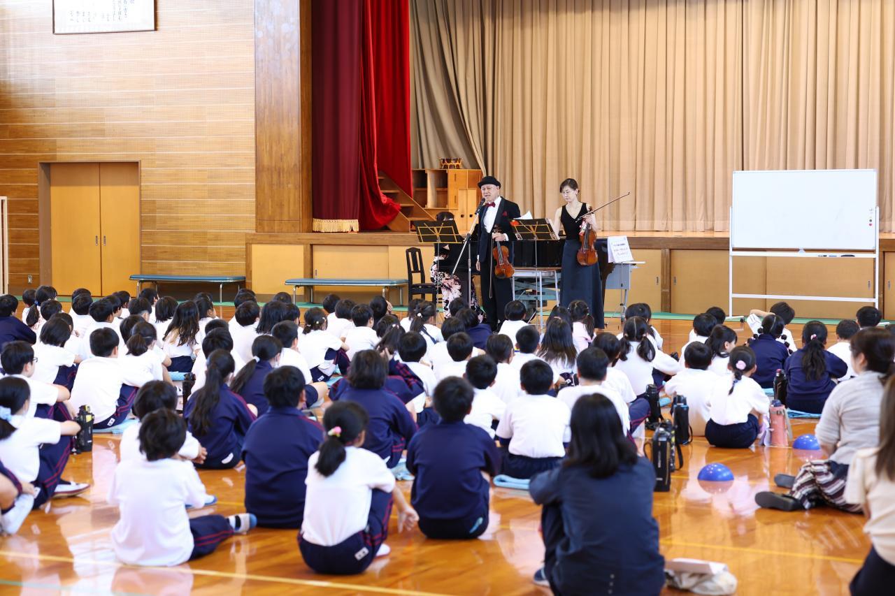 サンデー西村さんのバイオリンと岸野さんのビオラと中野さんのピアノの演奏です。神代保育所の年中さん年長さんも招待して、全校生で音楽鑑賞をしました。ジブリメドレー、銀河鉄道999、神代小学校校歌など知っている曲をたくさん演奏してもらいました。大きな声でみんな口ずさんでいました。クラッシクの名曲の演奏も、どこかで聞いたことがあるなあと思わせる有名な曲ばかりを短くたくさん紹介してもらいました。バイオリンの楽しい説明もあり、あっという間の一時間でした。