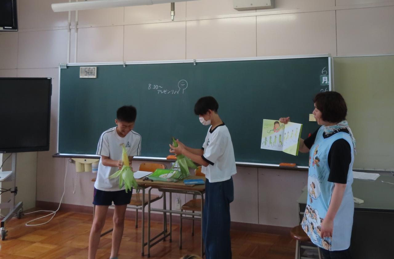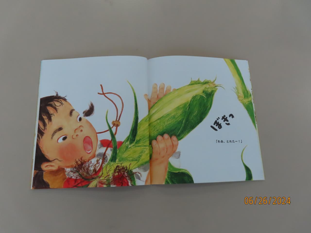 「でてこいでてこい! とうもろこし」という絵本を読んでいただきまました。なんと本物のとうもろこしも持ってきていただきました。実際茎の部分からもぎ取ろうとすると「ばっき」と音がします。初めての体験で子どもたちからは歓声があがっていました。