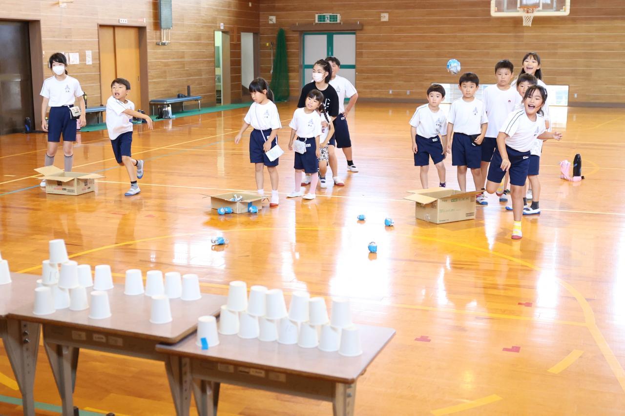 くましろ祭に向けて協力する力をつける夏祭りにしたい!!を目標に、全校生が、楽しめるように考えました。ナンバータッチゲーム、ボーリングなど仲良く協力が必要なゲームを考えました。縦割り班が8班なのでお店を8店つくり、暑い時期なのでクーラーのある部屋を使うようにしました。全校生、楽しい時間を過ごしました。