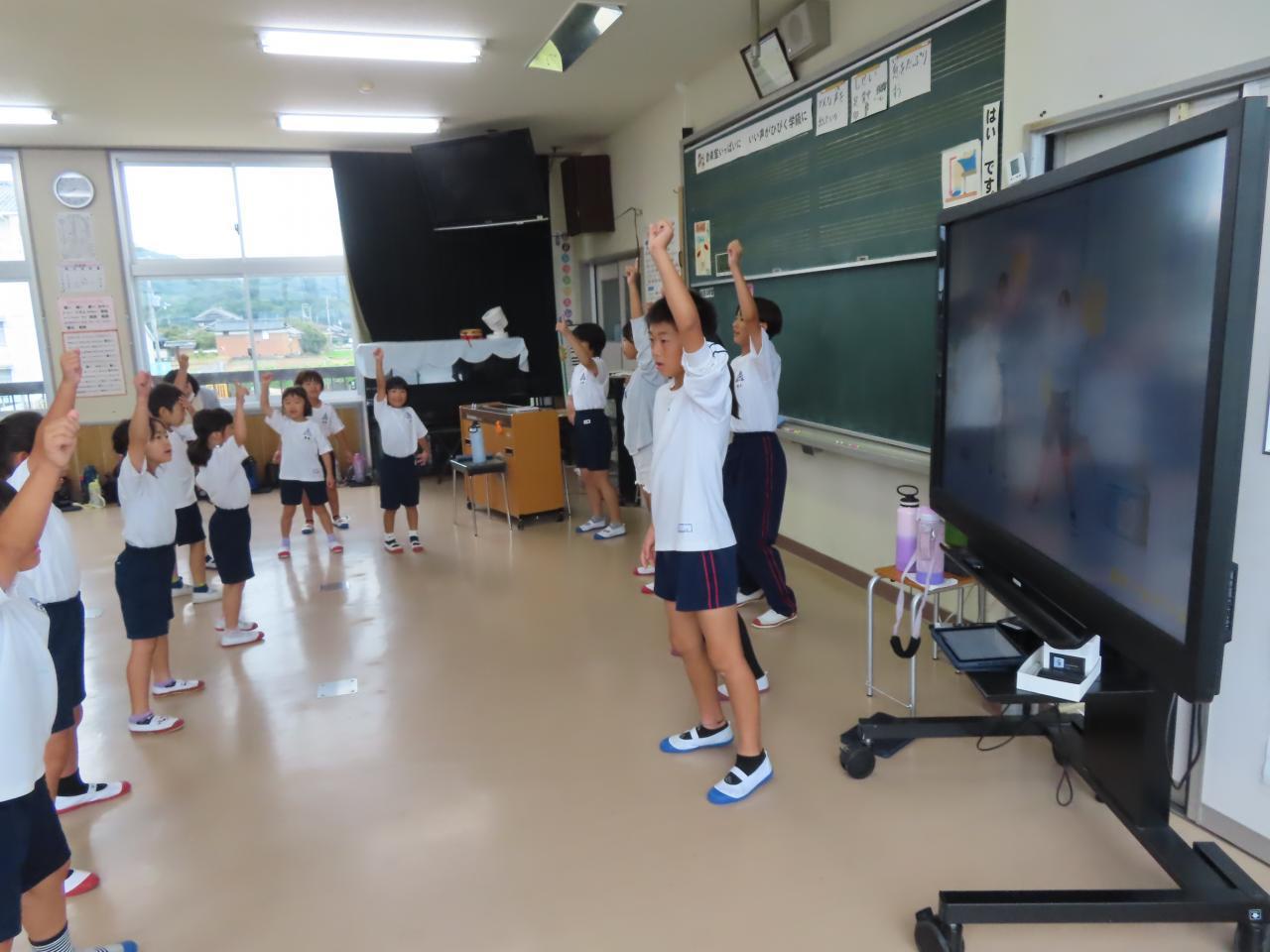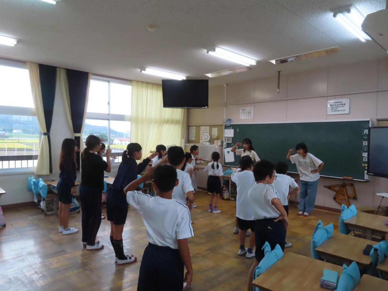 縦割り班で、6年生が中心となってダンスの練習をしました。みんなの前でダンスを踊るだけでなく、タブレットを駆使して、テレビ画面に大きく見本の演技を映したりしながら、練習をすすめました。1年生も一生懸命踊っていました。