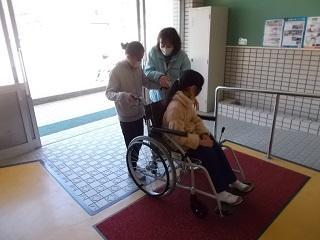 子どもたちは、職員の方の注意を聞いた後、安全に気をつけながら介助を必要とする人や介助をする人の立場で慣れ親しんだ学校の敷地内を移動しました。