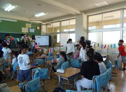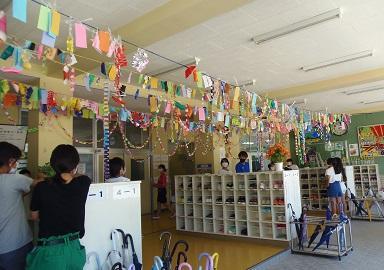 朝、児童玄関で七夕飾りが子どもたちを迎えてくれています。先日、6年生が中心となってて、七夕集会が行われました。以前は、体育館で実施していましたが、今年は空調のある教室でグループごとに活動をしました。