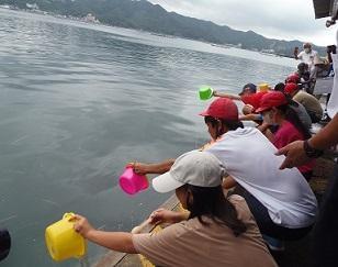 その後、福良漁港へ行き、ナマコの放流を体験しました。みんなのナマコが大きく育ち、福良の海がより豊かな海になることを願い稚ナマコを海へ放流しました。身近な福良の海の違う一面を知り、水産業に携わる方々の熱意にふれる機会となりました。