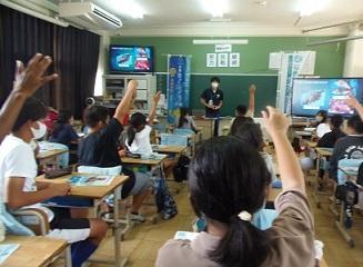 この日、6年生33名は南あわじ市水産振興課と洲本農林水産振興事務所水産課の方による出前講座で福良や淡路島の漁業や海の生き物や環境等について学びました。