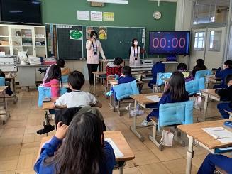 南あわじ市の小学生は、「南あわじ市食育チャレンジ事業」に取り組み、生活習慣「早寝・早起き・朝ごはん・朝トイレ」の振り返りを行っています。本日、2年生が南あわじ市健康課より2名の講師をお招きして、食育チャレンジ2回目の授業を受けました。まず、アンケート結果から自分の生活を振り返りました。その後、普段何気なく飲んでいる飲み物に入っている砂糖の量について考えました。冷たくておいしいジュースに砂糖のスティックがどのくらい入っているかを考えました。私たちの体は食べたものでできています。自分の食生活と健康を意識できる人に育ってほしいと願います。引き続き、ご協力よろしくお願いします。