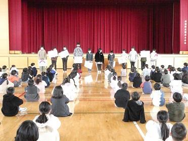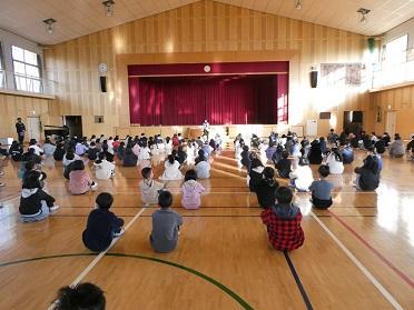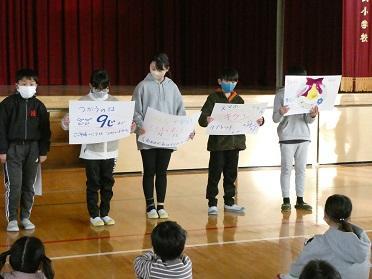さて、校長の式辞では次の3つの話をしました。1つ目は「学ぶ楽しさ日本一」の合い言葉にふれ、2学期の出来事を思い出しながら自分がどのように成長したかをあゆみをもとに振り返ろうということ。2つ目は、クリスマスやお正月など家庭での行事が多い休み中、お手伝いをして家族とともに過ごす時間を大切にしようということ。3つ目は、自分の健康と命は自分で守るということ。式の後には、保健給食委員会の児童がタブレットやゲーム等の使い方について啓発の呼びかけをしてくれました。