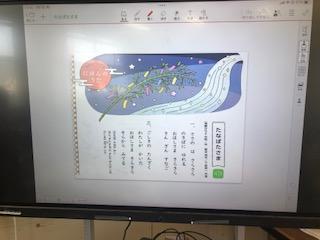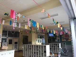 この日は、短冊に願い事を書いて笹の葉に飾る風習があります。子どもたちの願いが空に届くようにと、色とりどりの飾りが風に揺れる様子はとても美しいですね。(本校は笹ではなく、鈴丹テープに願いを書いた短冊をくくり児童玄関に飾りました)
