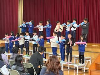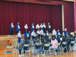 続いて2年生が「こぐまの2月」をピアニカで上手に演奏し、その後はプラカードを掲げ、大きな声で6年生の卒業を祝いしました。最後の❤がかわいかったです。