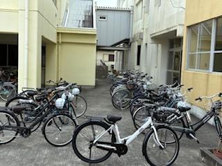 出発前、昇降口前ではヘルメットの装着を確かめ合い、ブレーキやライトの点検を手際よく済ませました。
