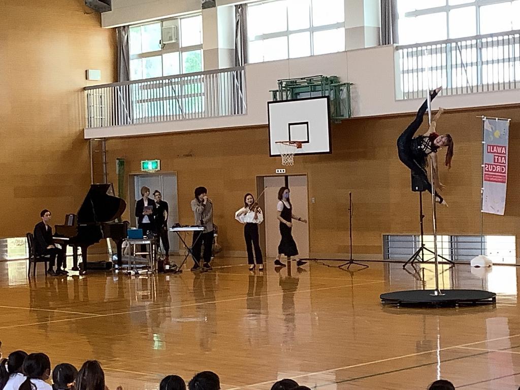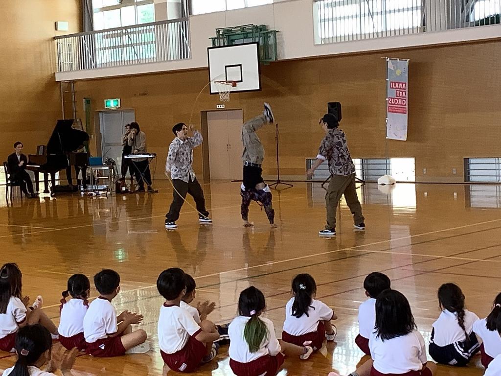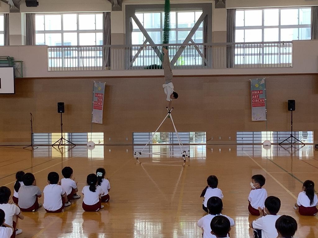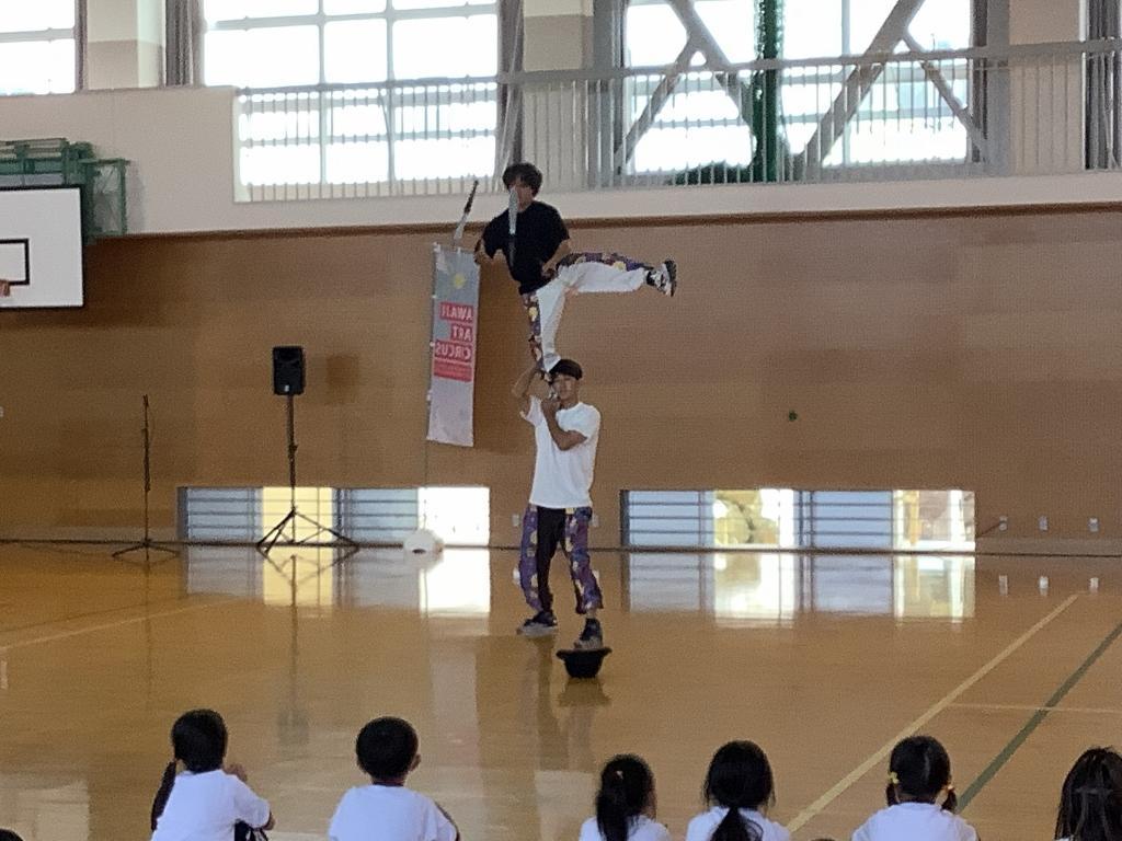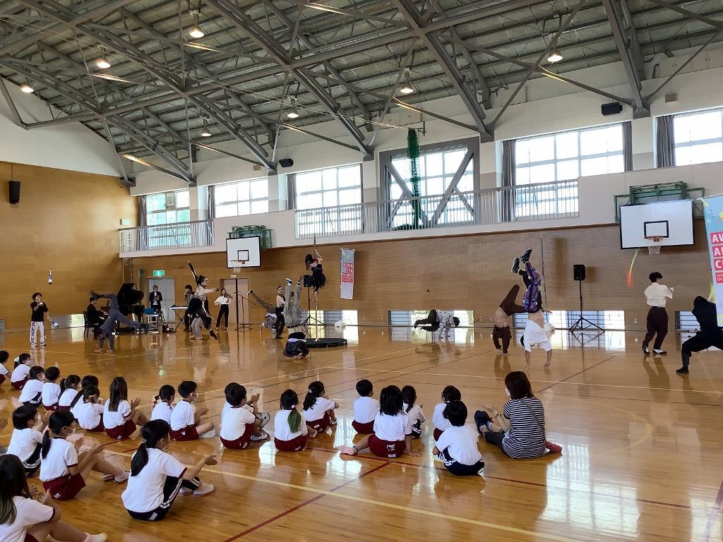 Awaji Art Circusが北阿万小学校へ公演に来て下さり、全校生で観ることができました。トップレベルのアーティストらが、息をのむアクロバットやトリッキング、フリースタイルダンス、コンテンポラリーダンスなどを、ピアノとバイオリンの生演奏やボイスパーカッションにのせて披露してくれました。児童たちは、プロのパフォーマンスに驚きながら見入っていました。普段は生で味わうことのできない公演を観ることができ、とても喜んでいるようでした。