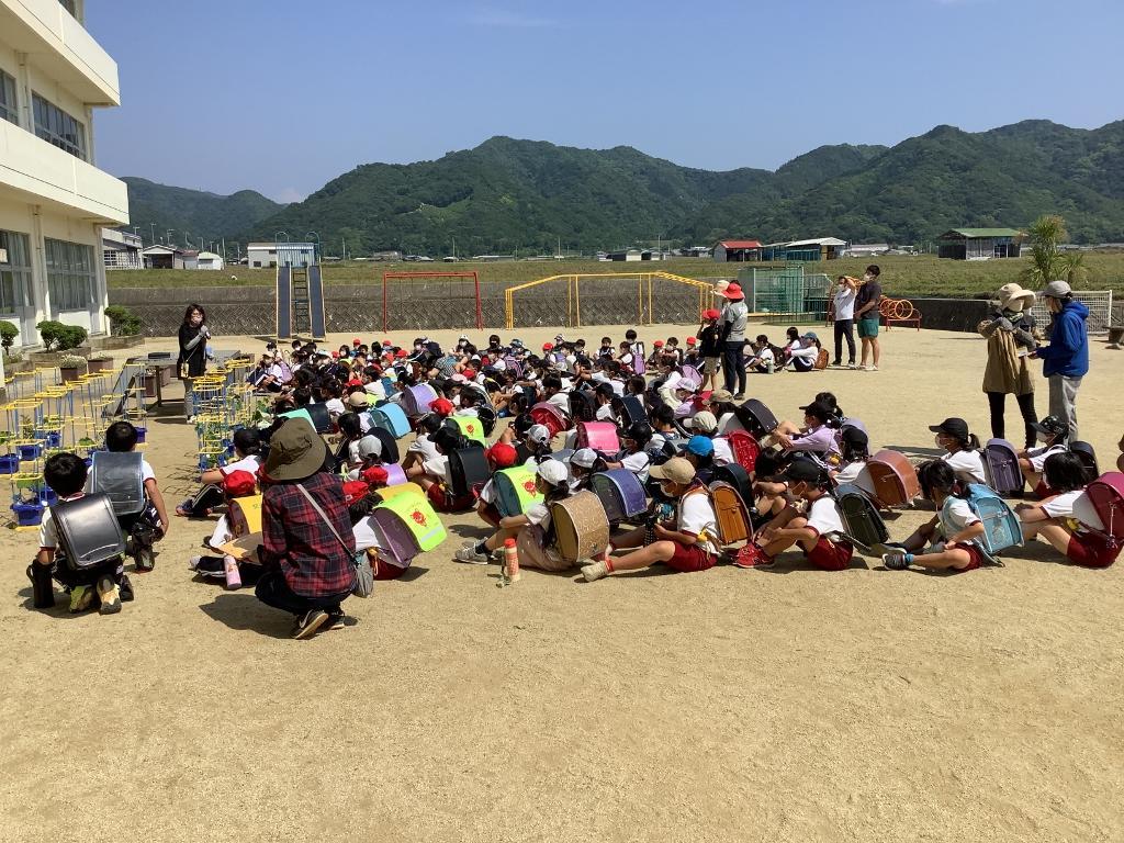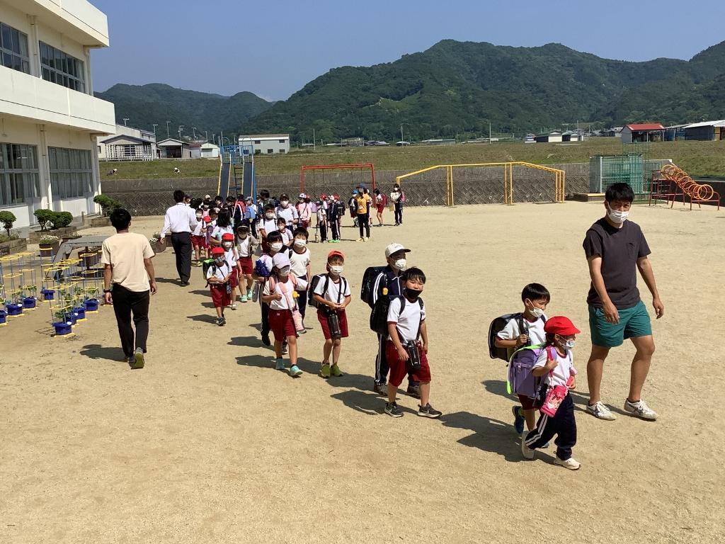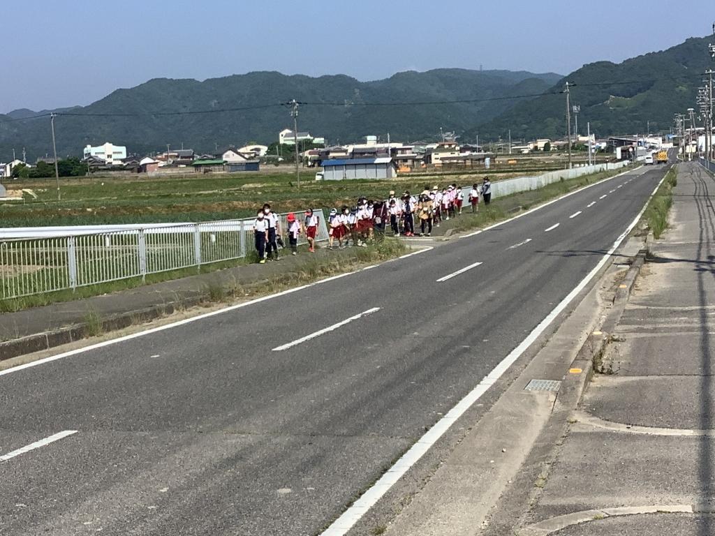 今日は、学期に1回行う一斉下校でした。通学路確認と安全点検のため、全校児童が地区ごとにまとまって一斉に下校しました。また、自分の家の近くにある子ども110番の家の確認も行いました。