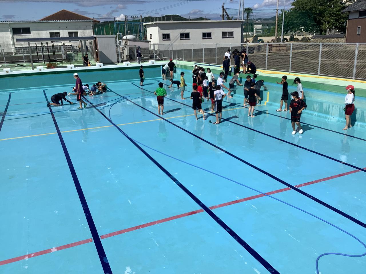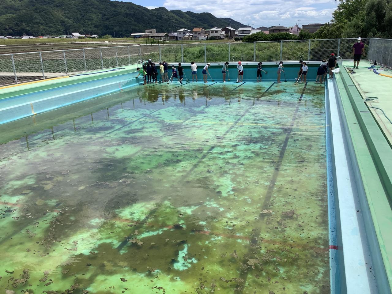 4、5、6年生は、プール清掃をしました。プールに貯まっている水を排水しながら、中にある藻をこすって流していきました。一面に暗い緑色だったプールは、みるみるキレイになっていきました。プールサイドも磨いて流しました。これから水を張り、水の検査をして準備をしていきます。20日(月)からは、いよいよ水泳の授業が始まります。