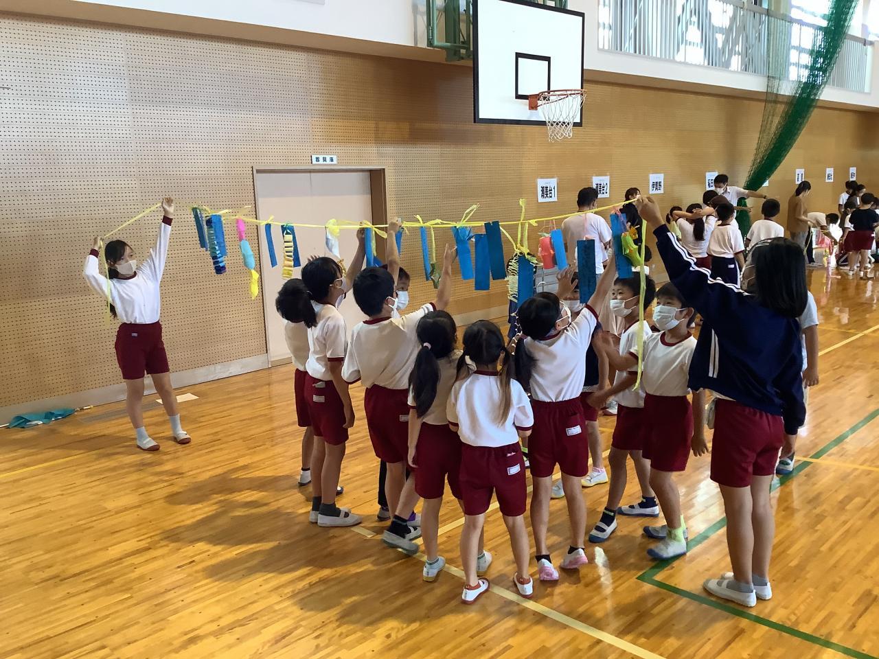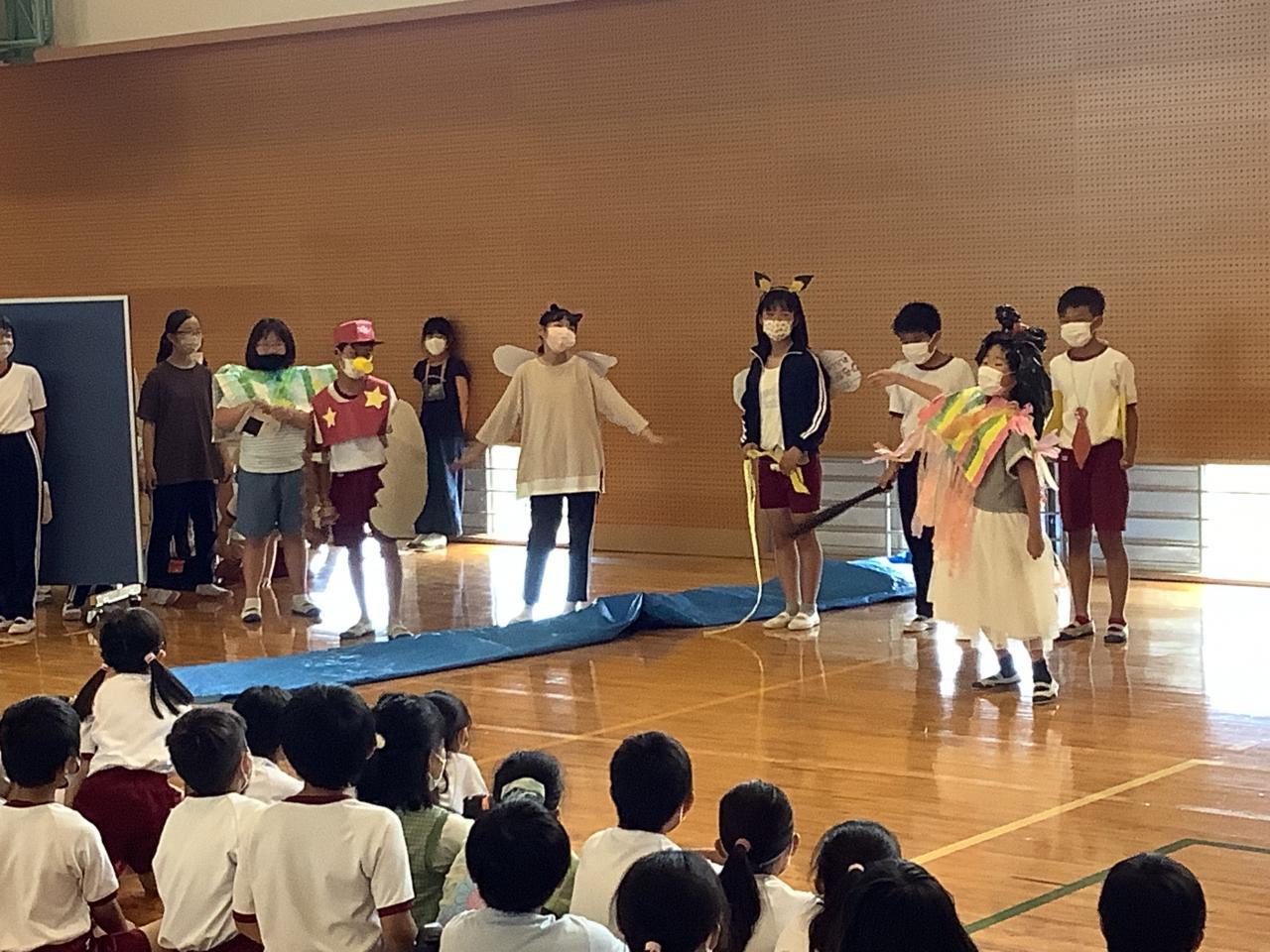 3,4校時に、全校生で七夕集会をしました。各自が願いごとを書いた短冊を持ち、体育館に集合しました。「きたあまのよいこ」のなかよし班に分かれて、願いごとをみんなに伝えたり、協力して飾り付けの作業を行ったりして、学年を越えた親睦を深めました。その後、6年生による七夕劇が披露されました。ユーモアあふれる劇を、みんな楽しそうに観ていました。劇の最後には謎解きゲームがあり、なかよし班で協力して取り組むことができました。児童会運営委員が中心となって企画運営し、6年生が協力してみんなが楽しめる活動の場を作ってくれました。6年生のみなさん、お疲れ様でした。そして、ありがとうございました。