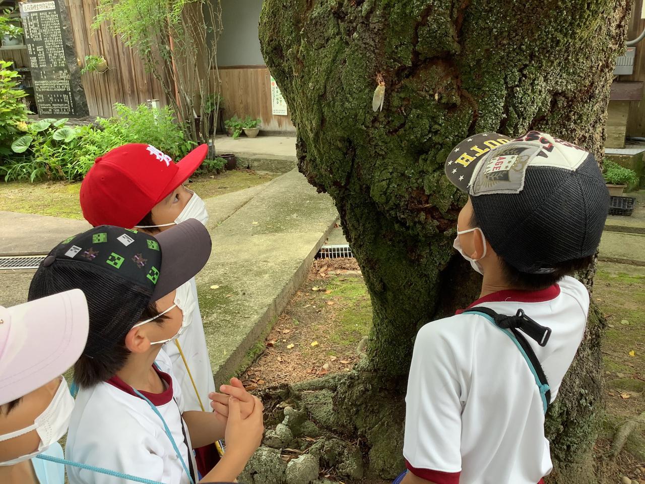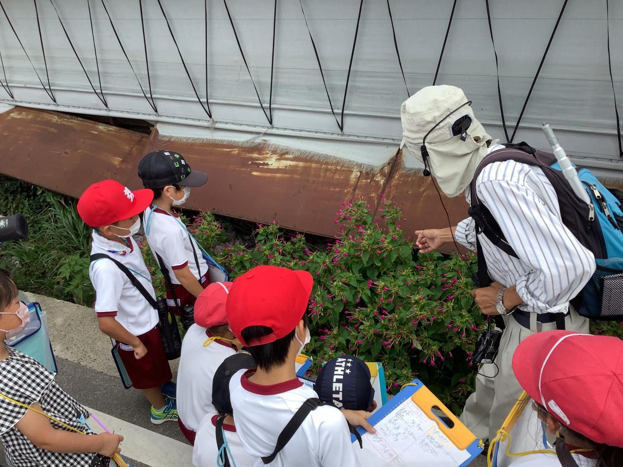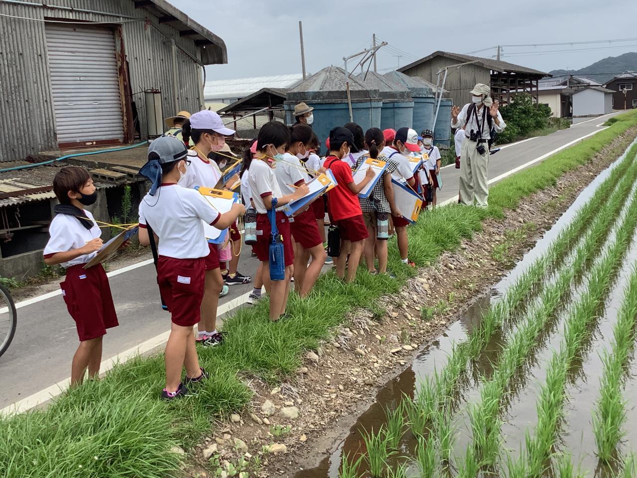 兵庫型体験教育の一つである環境体験事業で、3年生が4年生と一緒に大日寺まで歩いて行ってきました。この事業は、里山、田畑、水辺などで自然とふれあう体験型環境学習で、年3回行う予定です。講師に竹田俊道さんをお迎えし、大日寺までの道に見られる植物や昆虫、鳥について説明を聞き、各自がメモを取りながら学習しました。普段から身近に見られる植物の名前を知ったり、水田に見られる昆虫や鳥について興味深く観察したり、とても熱心に取り組むことができました。曇り空で心地よい風が吹くなか、約2時間で学校へ戻ってきました。次回は、秋に予定しています。