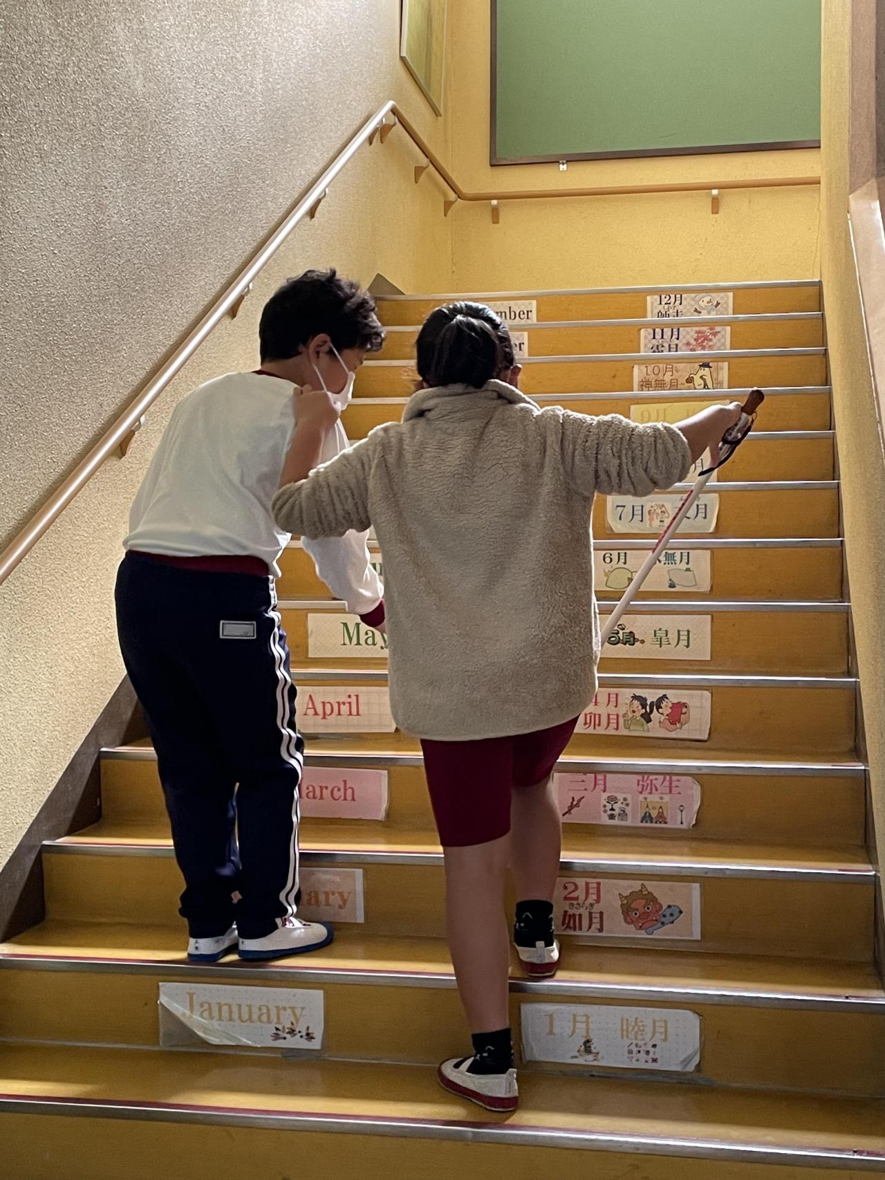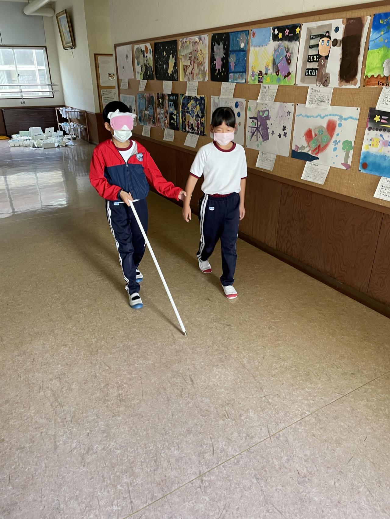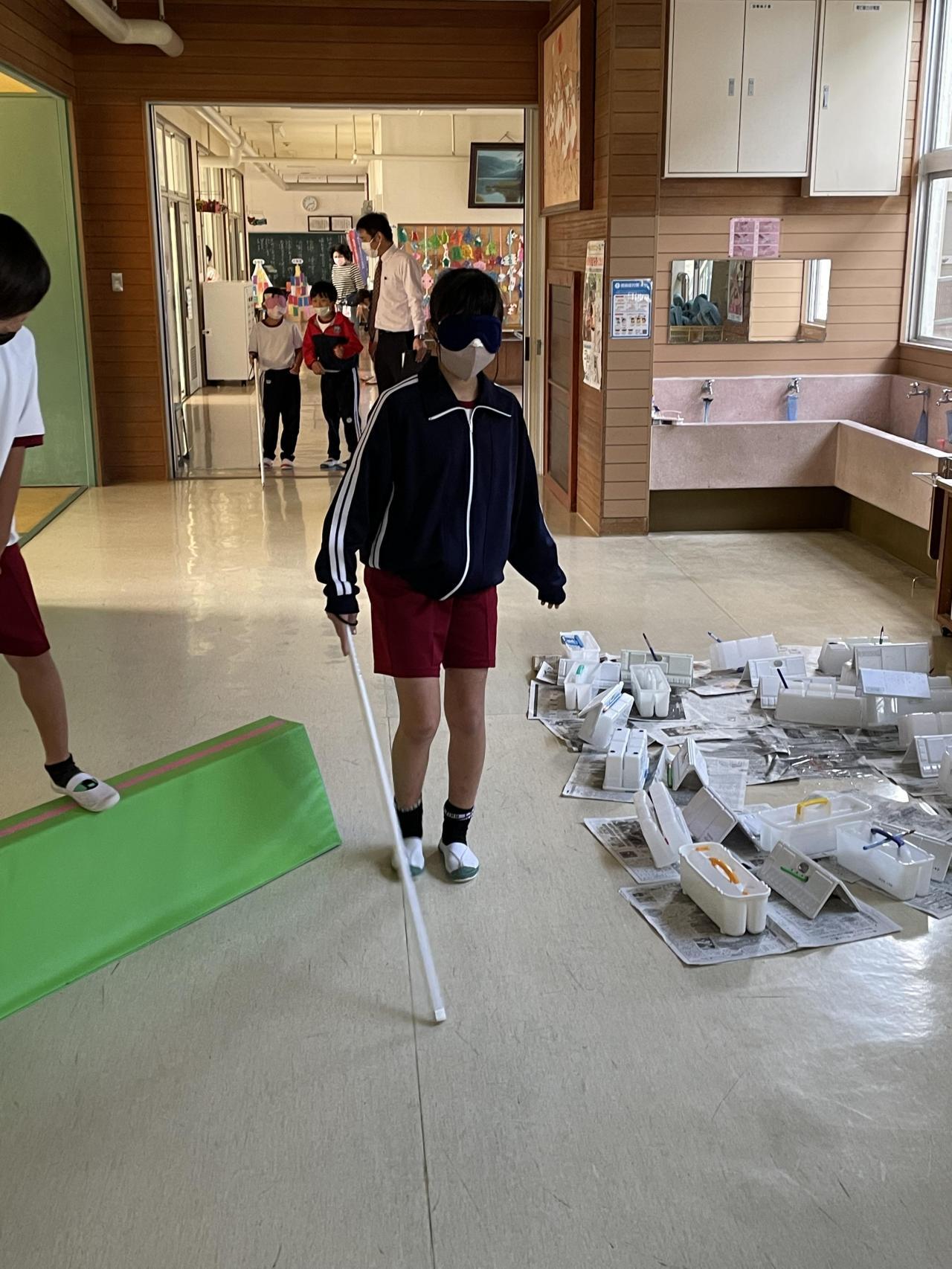 4年生は、総合的な学習の時間に白杖体験をしました。南あわじ市にご在住の目の不自由な方と社会福祉協議会の方が来られ、普段の生活の様子についてお話ししてくれました。そして、子どもたちからの質問にも答えてくださいました。子どもたちはその後、アイマスクをして白杖体験をしました。介助者を伴って2階から1階へと階段を下り、1階では一人で白杖を使って歩いてみました。再び、介助してもらいながら2階へ上がりました。4年生は、17日(月)に車いす体験を予定しています。