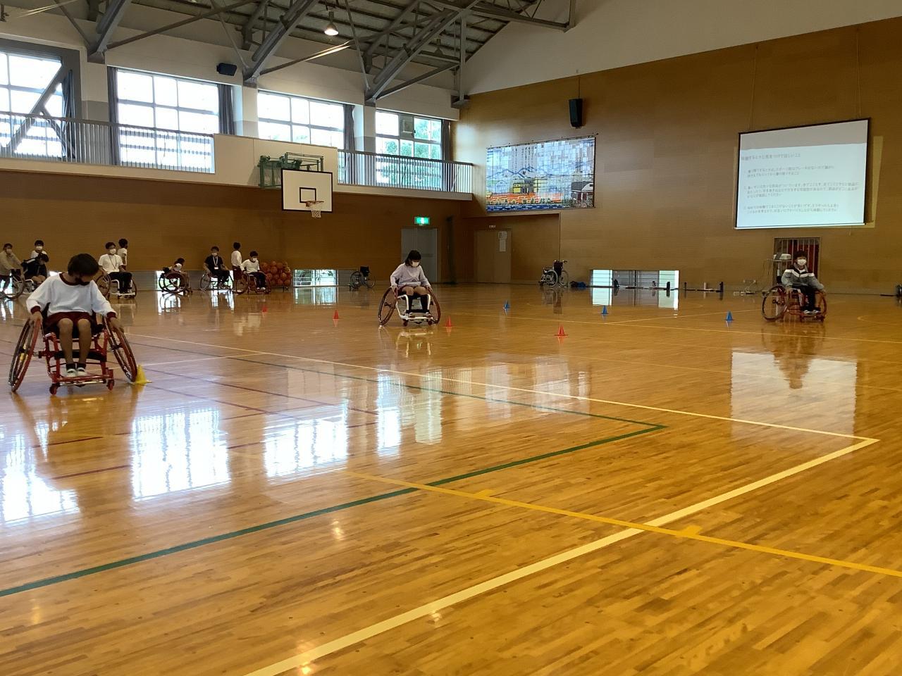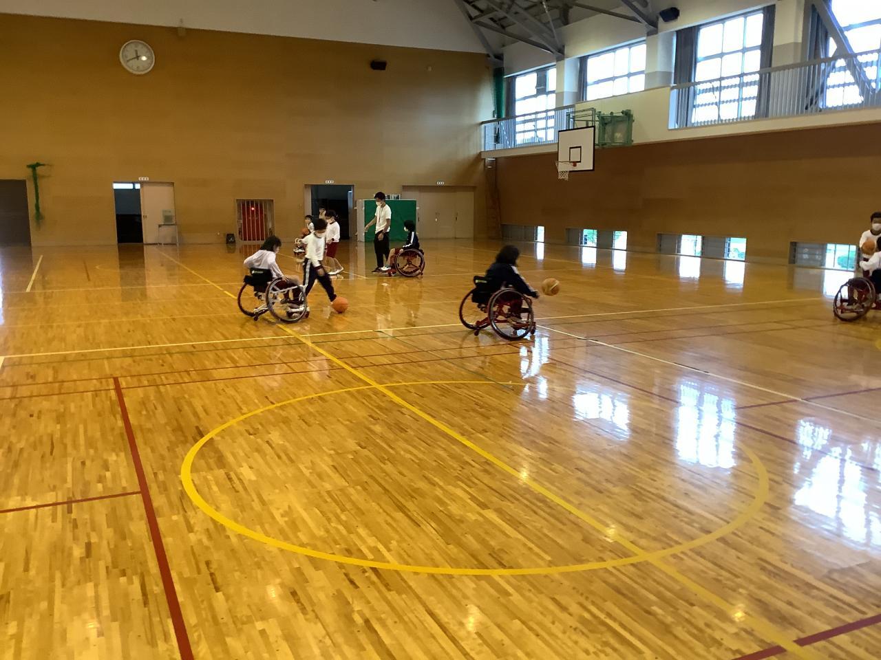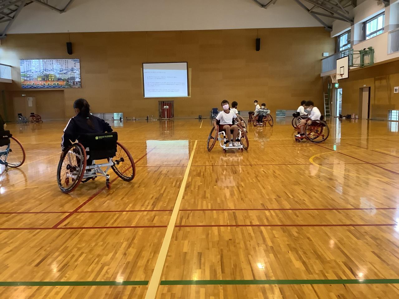 福祉体験学習として、4年生が車いす体験をしました。兵庫県障害者スポーツ交流館より講師をお招きし、南あわじ市社会福祉協議会の方たちと学習しました。まず、車いすを使う目的や、車いすを使う人にどんな声かけをして手助けをしたらよいか考えました。次に、普通の車いすと競技用の車いすについて、実物を見たり実際に座ってみたりしながら、その違いについて意見を出し合いました。そして、競技用車いすに乗って運動しました。最初はまっすぐに進まなかったり、思うように曲がれなかったりしましたが、次第に慣れてきてできるようになりました。早く進んだり、スピードを落としたり、ターンしたりしました。そして、バスケットボールを使ってドリブルしたり、パスしたり、シュートしたりしました。車いすに乗って動きながらボールを扱うのはとても難しそうでしたが、体験しながら楽しく学習することができました。