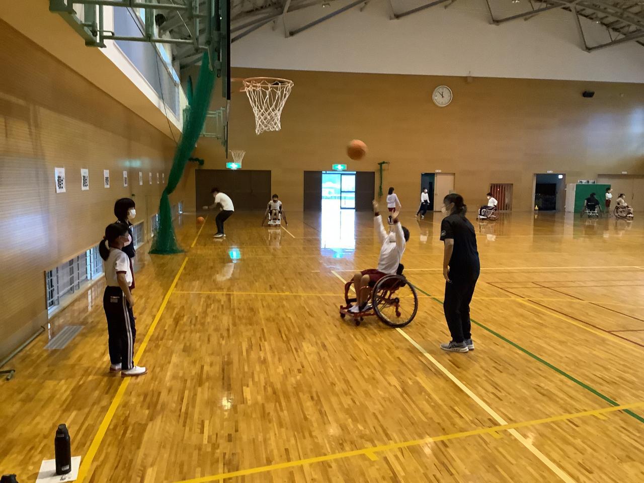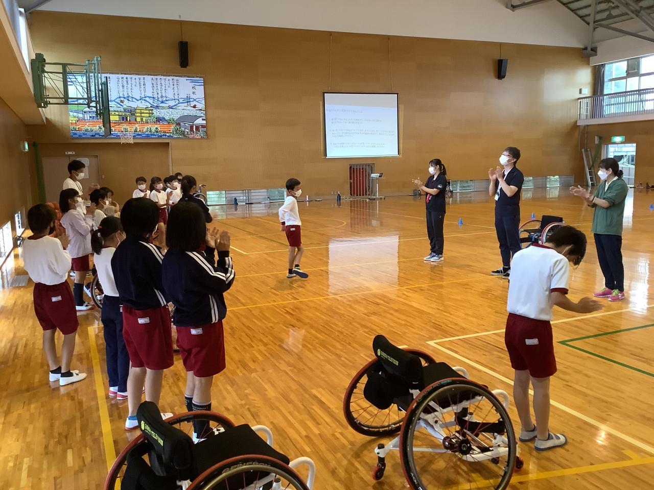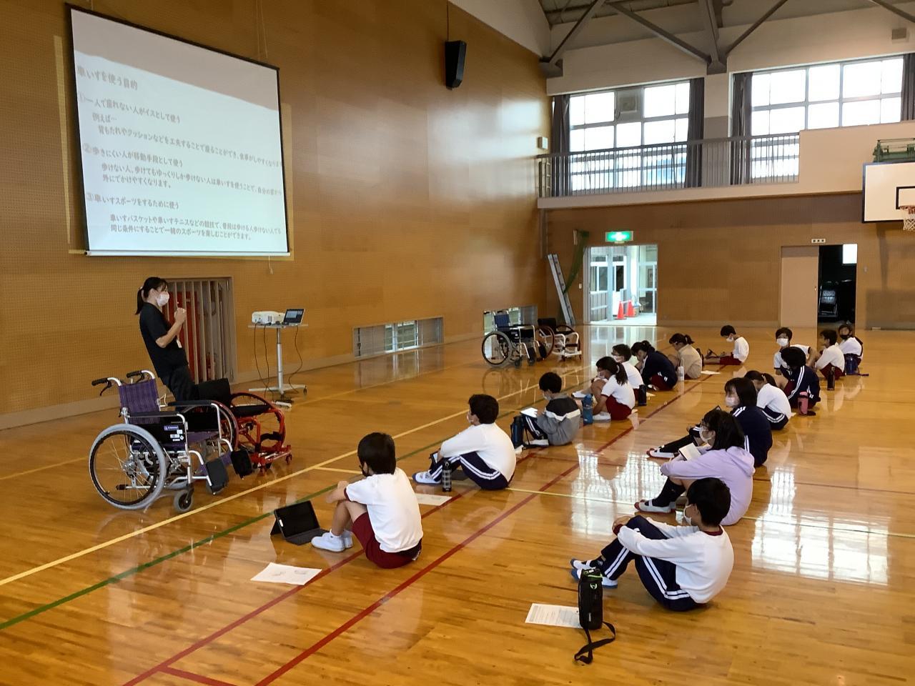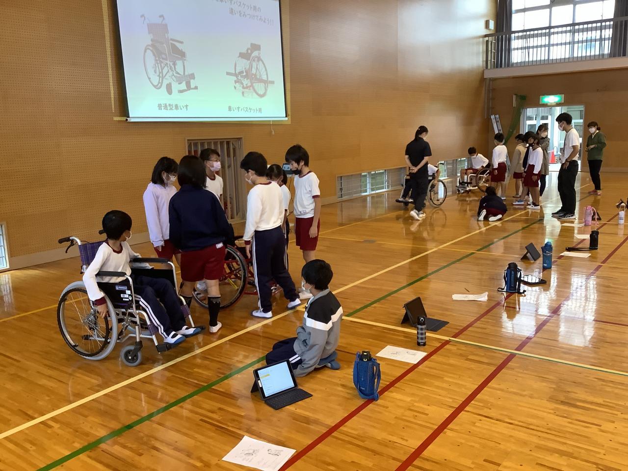 福祉体験学習として、4年生が車いす体験をしました。兵庫県障害者スポーツ交流館より講師をお招きし、南あわじ市社会福祉協議会の方たちと学習しました。まず、車いすを使う目的や、車いすを使う人にどんな声かけをして手助けをしたらよいか考えました。次に、普通の車いすと競技用の車いすについて、実物を見たり実際に座ってみたりしながら、その違いについて意見を出し合いました。そして、競技用車いすに乗って運動しました。最初はまっすぐに進まなかったり、思うように曲がれなかったりしましたが、次第に慣れてきてできるようになりました。早く進んだり、スピードを落としたり、ターンしたりしました。そして、バスケットボールを使ってドリブルしたり、パスしたり、シュートしたりしました。車いすに乗って動きながらボールを扱うのはとても難しそうでしたが、体験しながら楽しく学習することができました。