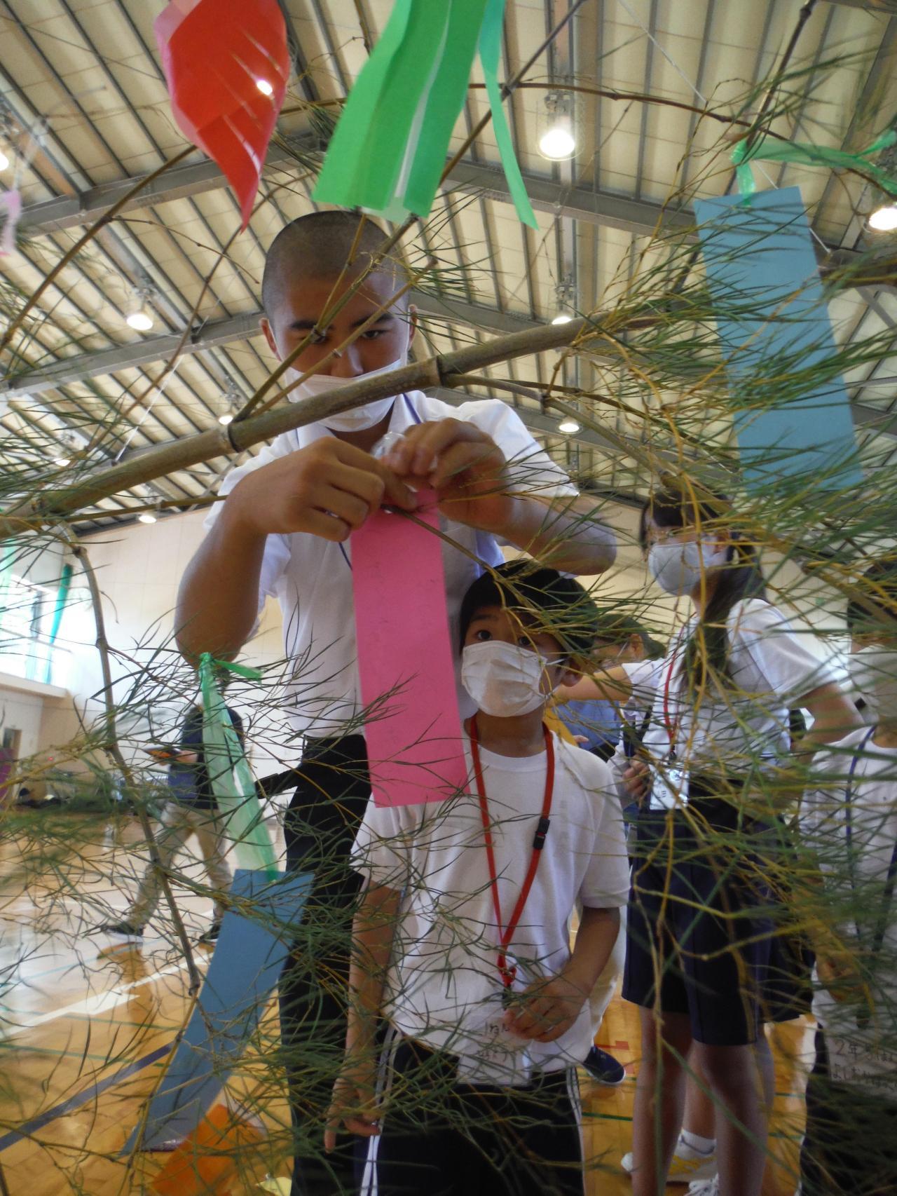7月7日は七夕ということで、小中合同の「七夕集会」を実施しました。まずは、短冊にそれぞれの願いを書いて笹に結びつけました。小学生が結びつけるのに苦労していると中学生が手伝ってあげるというような場面も見受けられました。