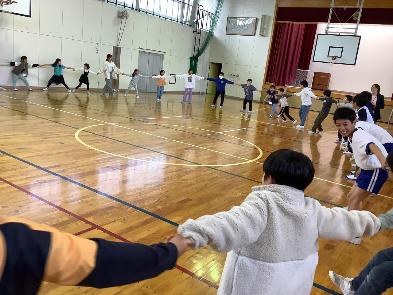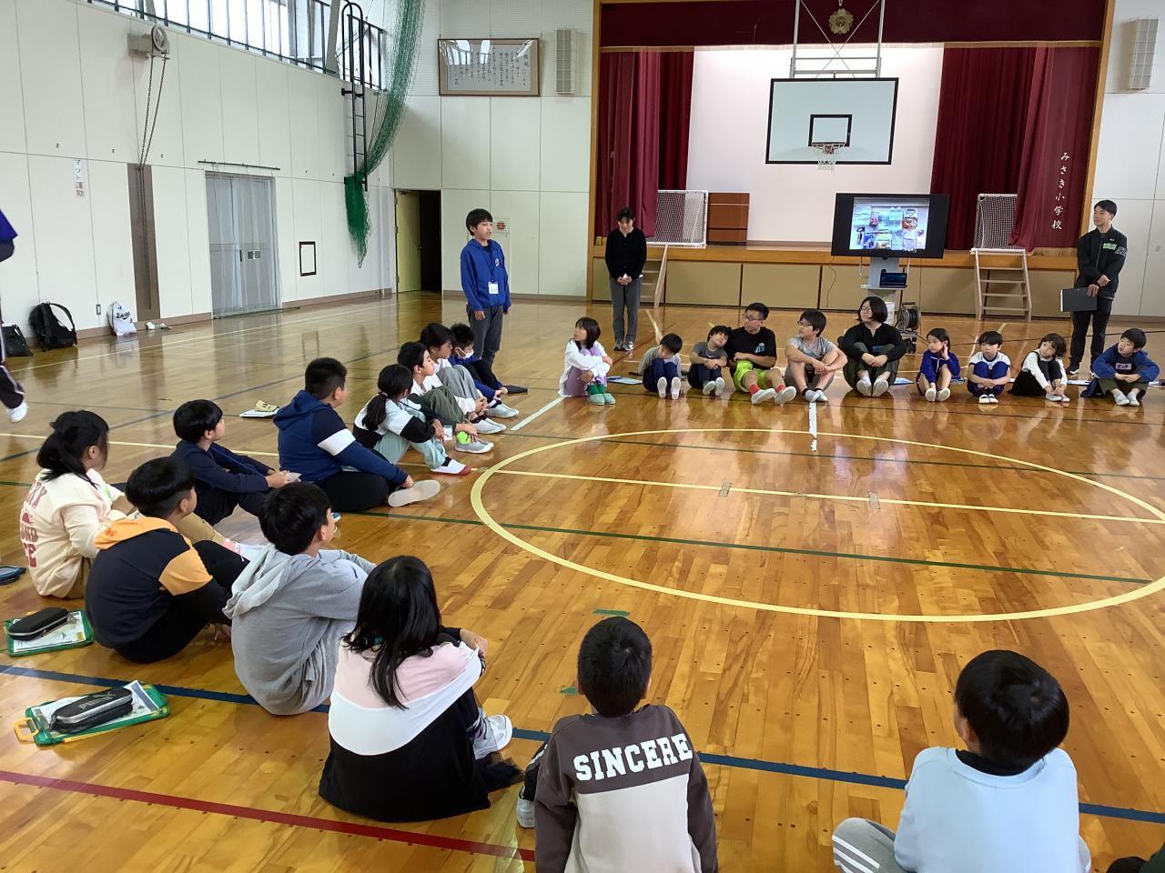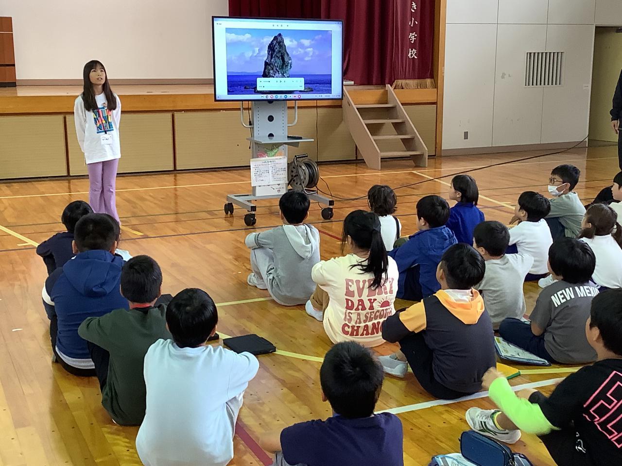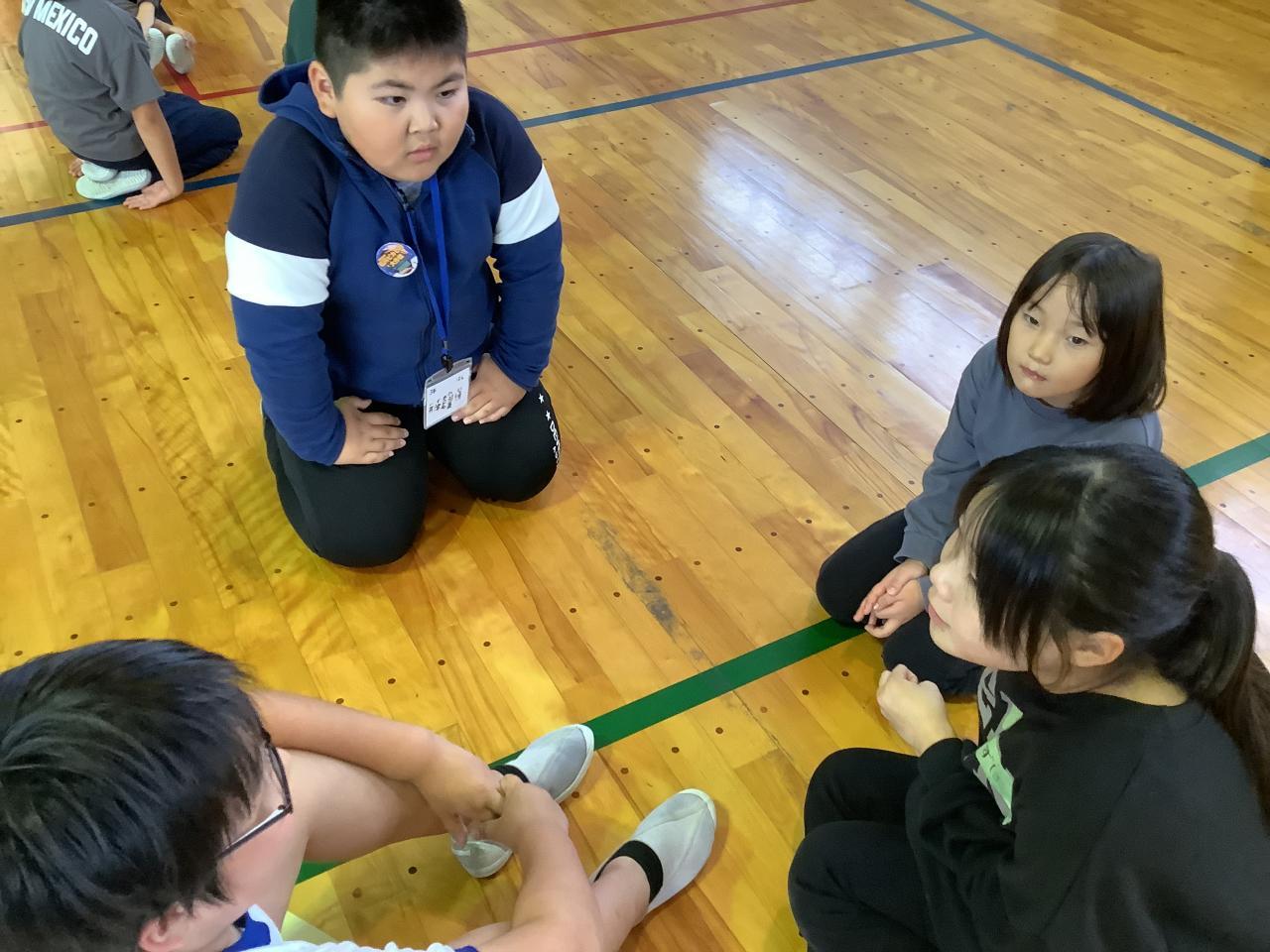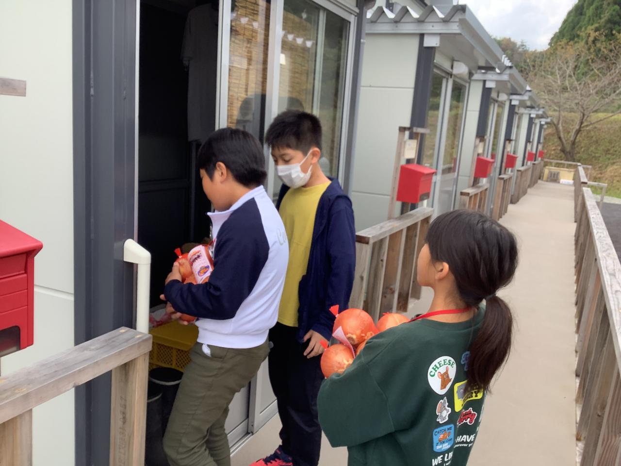 珠洲市立みさき小学校の子どもたち約30名と交流しました。まず、それぞれの学校紹介。その後、グループで防災学習〜防災リュックに入れるもの〜について意見交流しました。最初は、お互い緊張していましたが交流を通してすぐ打ち解け、笑顔いっぱいになりました。沼島小の代表から1、2年生の作った「石川ピカピカ大作戦」のバッジと折り紙のメッセージを送りました。また、運動場の仮設住宅の方々に淡路島玉ねぎをプレゼントしました。(原田青果さんの提供です)これもみなさん、喜んでくださいました。珠洲の人たちが笑顔になるたびに沼島っこの成長が感じられました。最後に、みんなで「ありがとうの花」の歌を歌いました。沼島っこもみさきっこも元気いっぱい、笑顔いっぱいになったひとときでした。