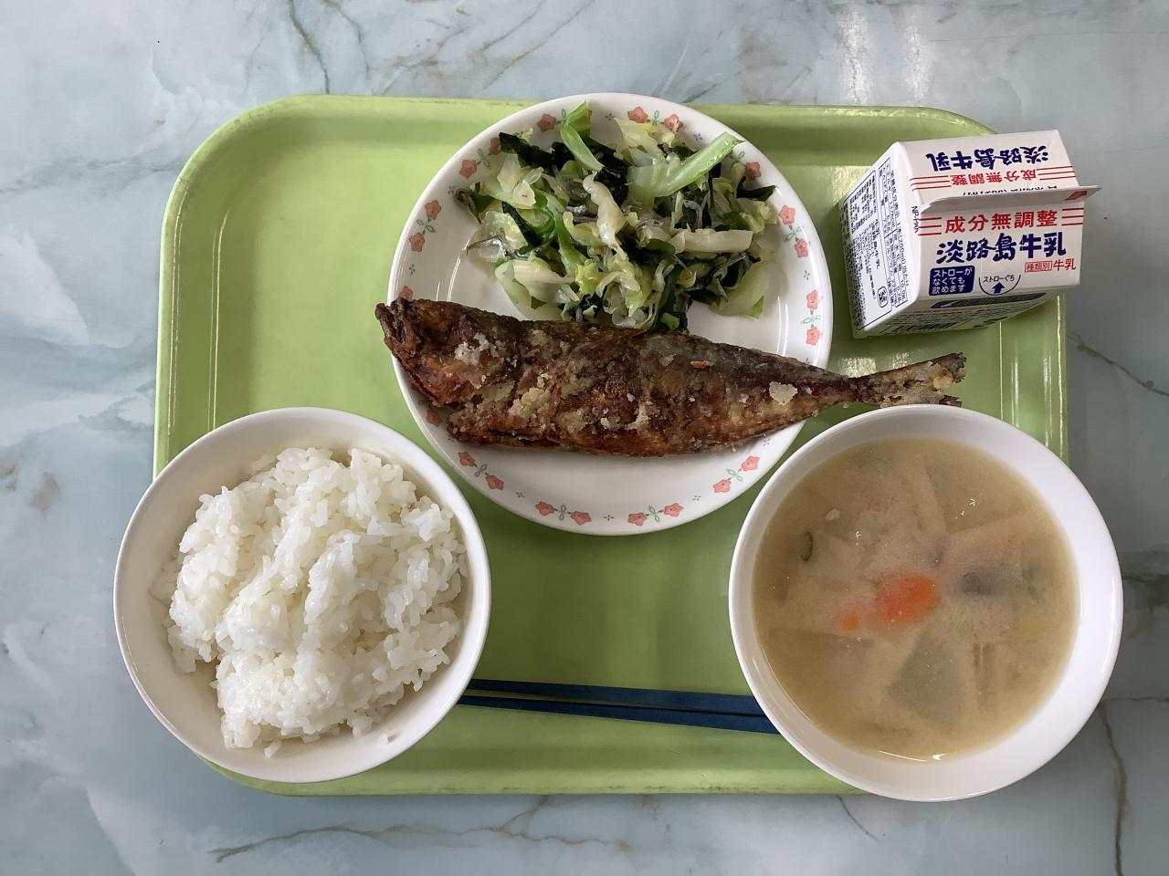 メニューは「沼島アジのから揚げ風」。沼島のアジは全国的にも有名で、給食には当然ながら初お目見えです。