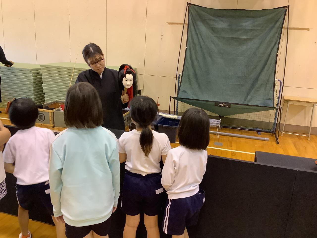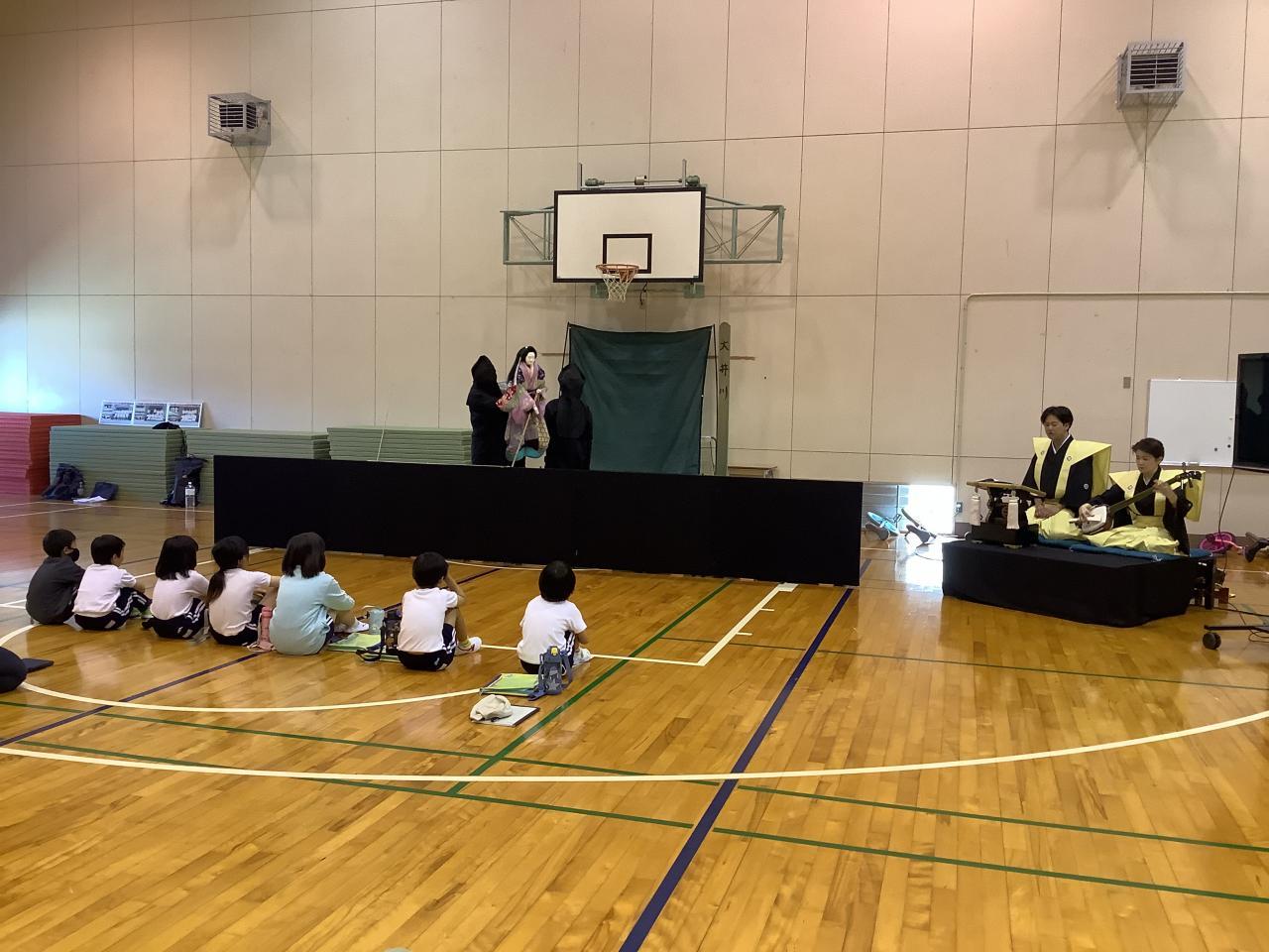 市内の小中学校では、南あわじ市の誇る伝統芸能である淡路人形浄瑠璃を題材とした授業を計画的に行っています。その一環として、淡路人形座の出前講座が体育館で行われ、1・2・3年の7名の児童が参加しました。