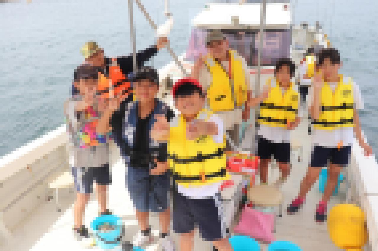 1・2・3・4年生は、山見さんに教えてもらいながら波止からサビキ釣り、5・6年生は、石井さんの船で船釣りに挑戦しました。
