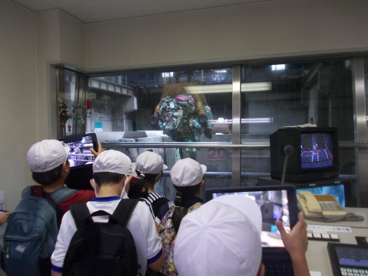 説明のあと、施設を見学しました。ごみピットの様子です。クレーンでごみを焼却炉に運んでいる様子です。実際の迫力に子供たちの目は釘づけでした。