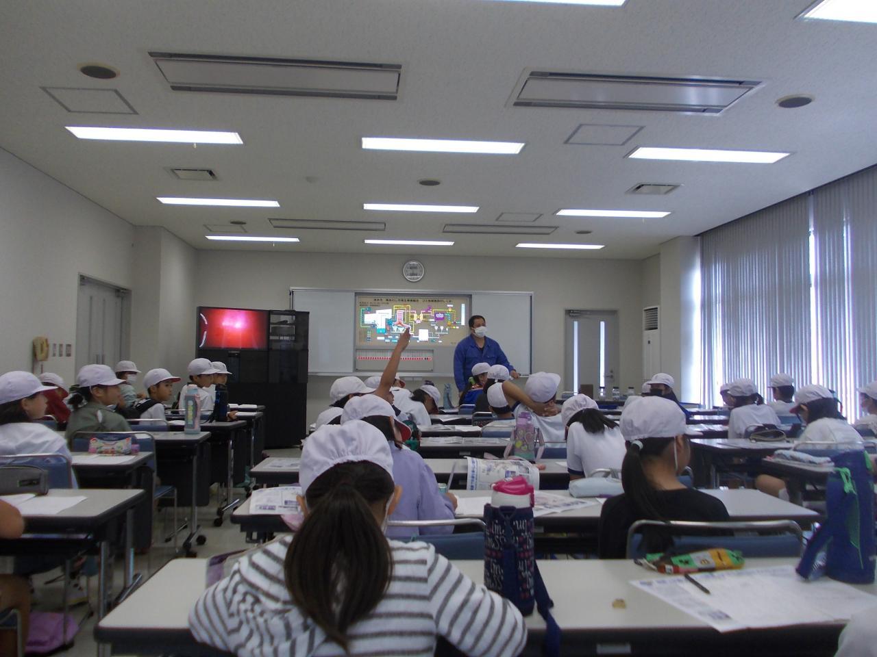 始めに職員の方にやまなみ苑のことについて説明をしていただきました。写真の左側のモニターは現在燃えているごみの様子です。説明のあと、たくさん児童から質問が出ましたが、どの質問に対しても職員の方はわかりやすく丁寧に答えてくれました。