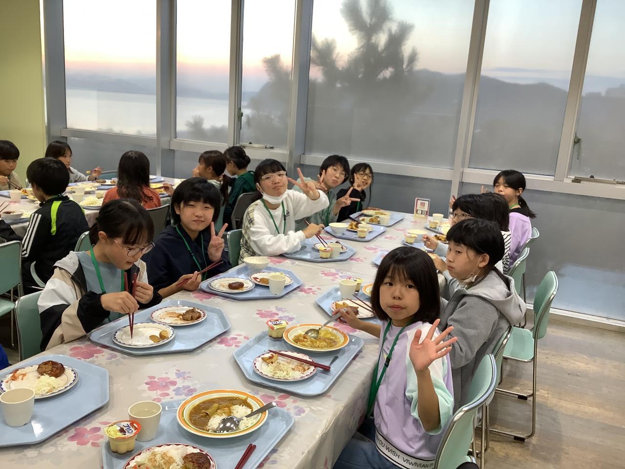 最後のメニューはみんな大好きな、カレーライス、ハンバーグ、フライドポテトがありました。窓の外には鳴門海峡の本当に綺麗な夕焼けが見えていました。きれいな夕焼けが、さらに食欲を誘いました。