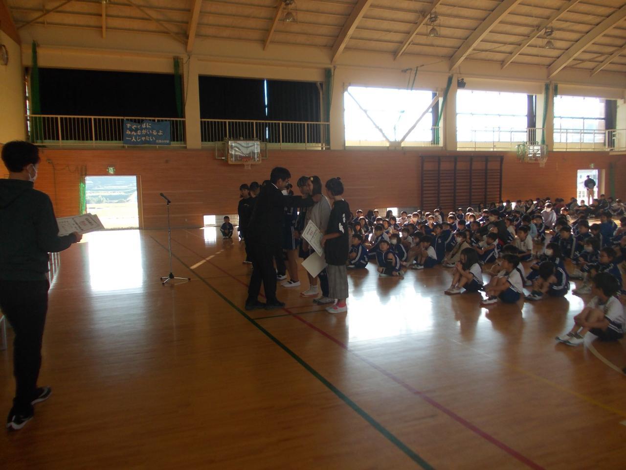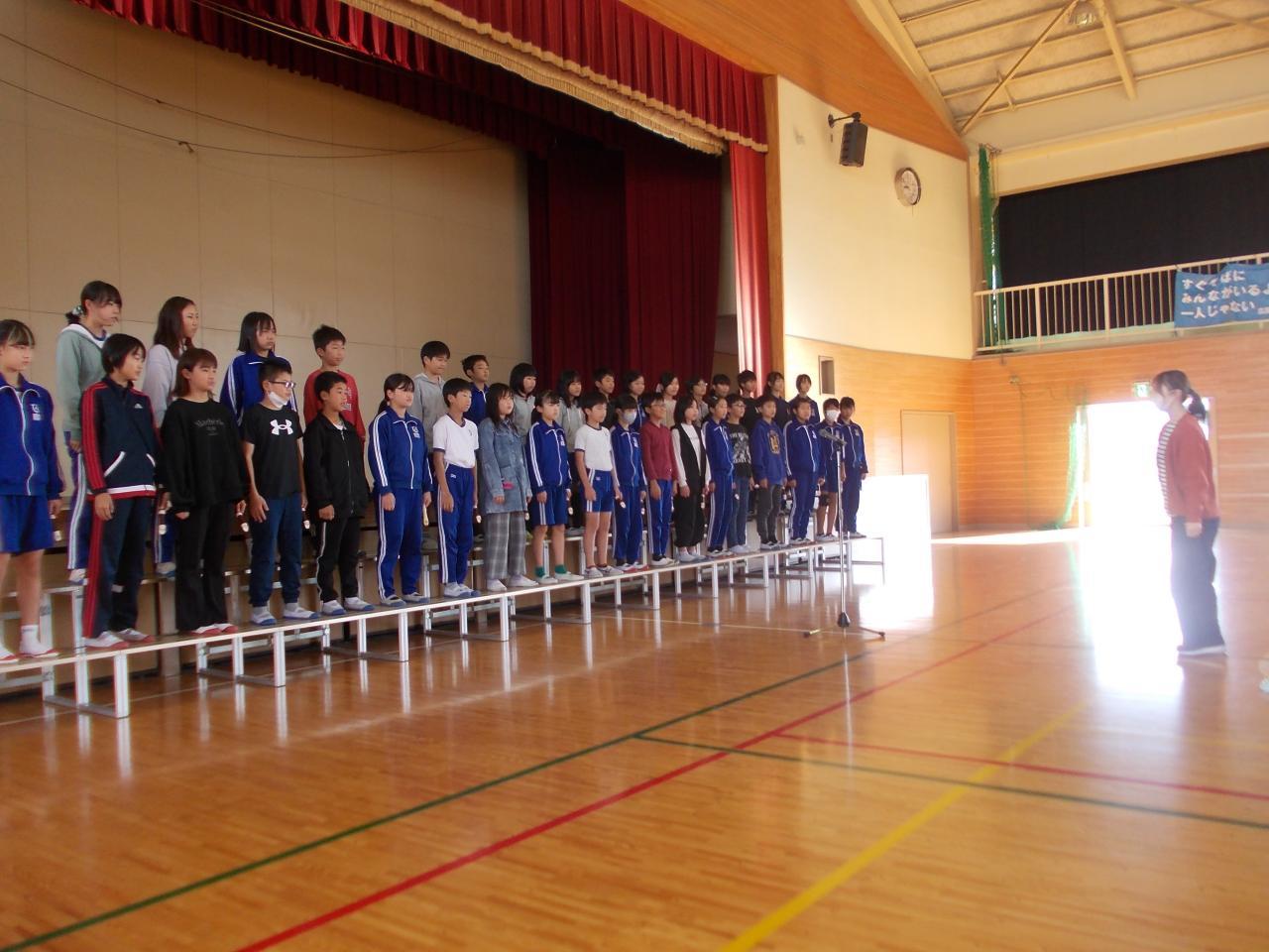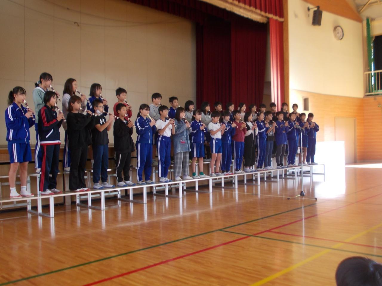 児童集会の最後に6年生が11月8日に「南あわじ市なかよよし音楽会」で演奏する